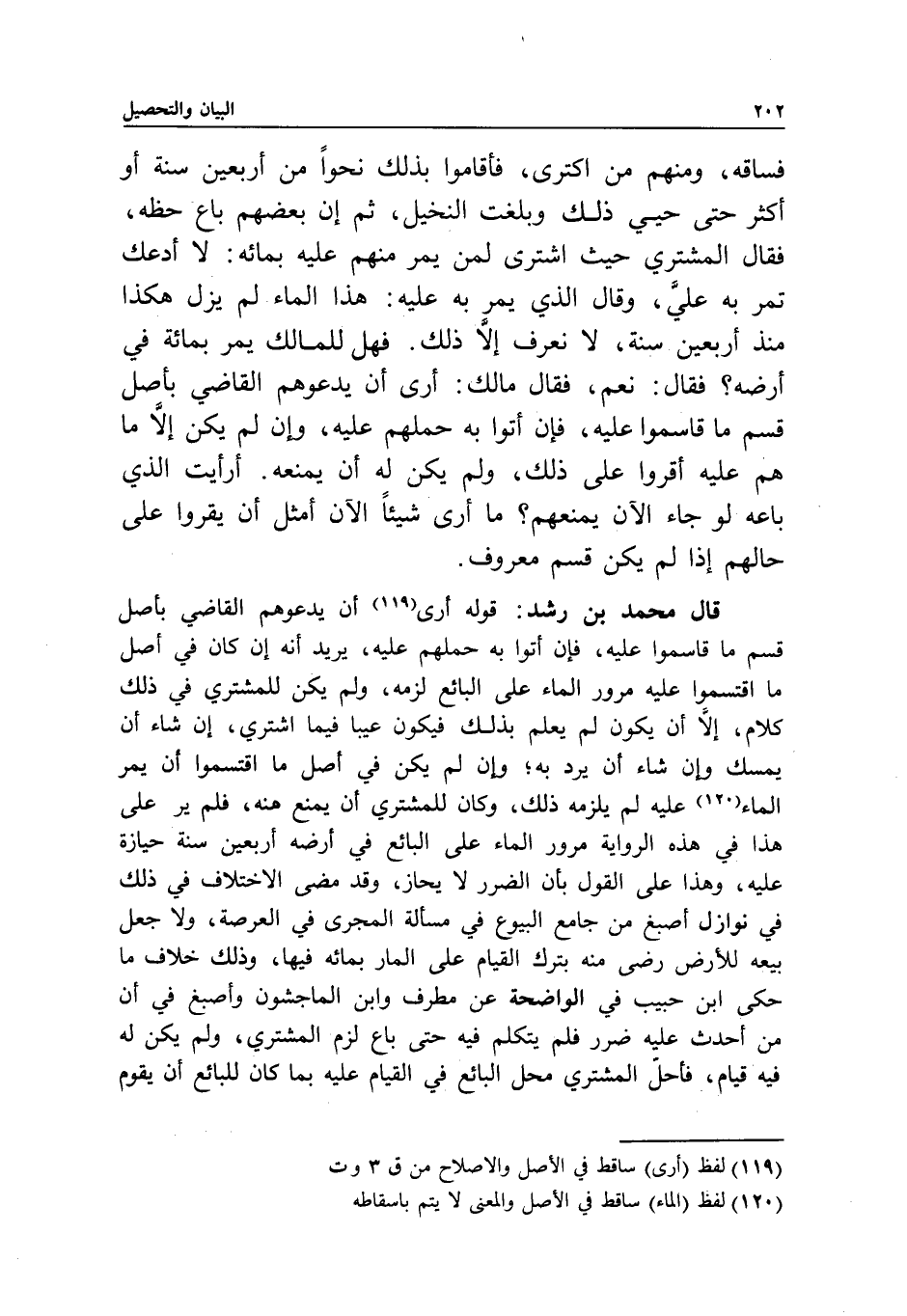 قال محمد بن رشد: قوله أرى أن يدعوهم القاضي بأصل قسم ما قاسموا عليه، فإن أتوا به حملهم عليه، يريد أنه إن كان في أصل ما اقتسموا عليه مرور الماء على البائع لزمه، ولم يكن للمشتري في ذلك كلام، إلا أن يكون لم يعلم بذلك فيكون عيبا فيما اشتري، إن شاء أن يمسك وإن شاء أن يرد به؛ وإن لم يكن في أصل ما اقتسموا أن يمر الماء عليه لم يلزمه ذلك، وكان للمشتري أن يمنع منه، فلم ير على هذا في هذه الرواية مرور الماء على البائع في أرضه أربعين سنة حيازة عليه، وهذا على القول بأن الضرر لا يحاز، وقد مضى الاختلاف في ذلك في نوازل أصبغ من جامع البيوع في مسألة المجرى في العرصة، ولا جعل بيعه للأرض رضى منه بترك القيام على المار بمائه فيها، وذلك خلاف ما حكى ابن حبيب في الواضحة عن مطرف وابن الماجشون وأصبغ في أن من أحدث عليه ضرر فلم يتكلم فيه حتى باع لزم المشتري، ولم يكن له فيه قيام، فأحل المشتري محل البائع في القيام عليه بما كان للبائع أن يقوم