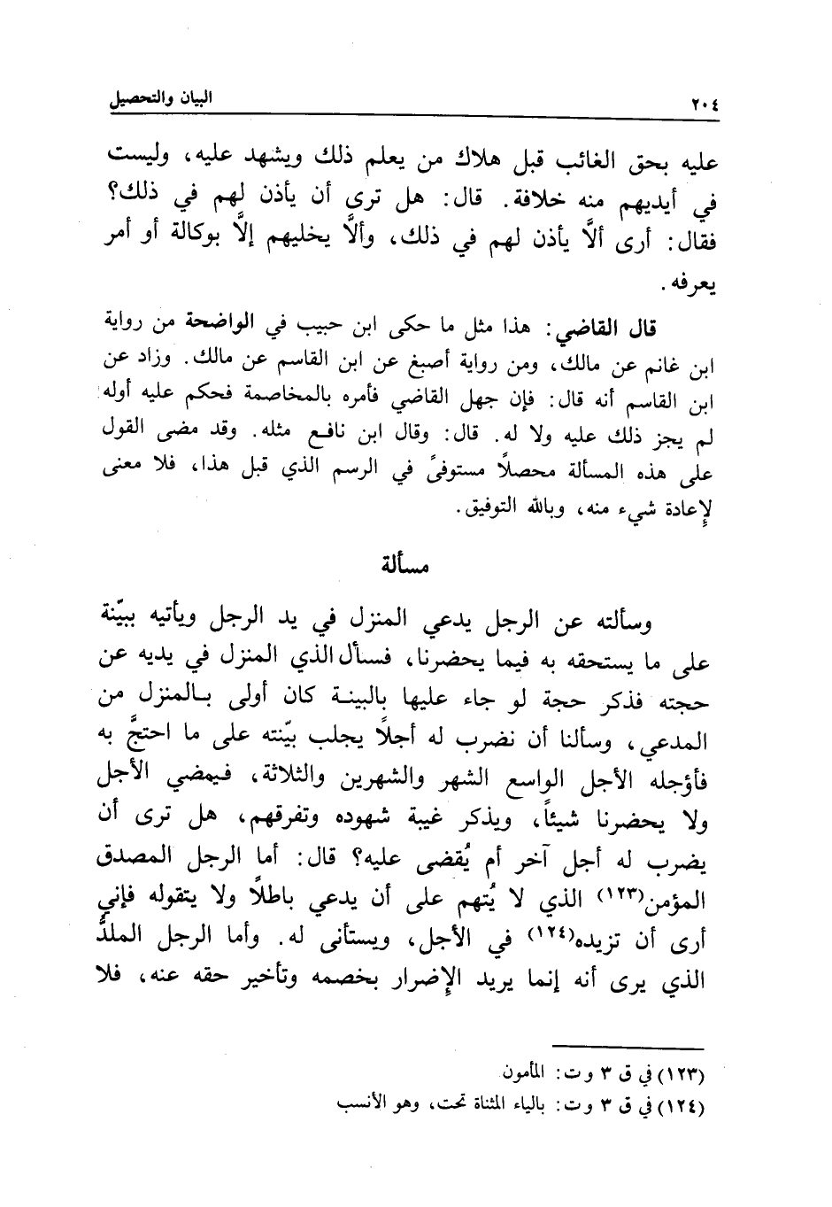 مسألة وسألته عن الرجل يدعي المنزل في يد الرجل ويأتيه ببينة على ما يستحقه به فيما يحضرنا، فسأل الذي المنزل في يديه عن حجته فذكر حجة لو جاء عليها بالبينة كان أولى بالمنزل من المدعي، وسألنا أن نضرب له أجلا يجلب بينته على ما احتج به فأؤجله الأجل الواسع الشهر والشهرين والثلاثة، فيمضي الأجل ولا يحضرنا شيئا، ويذكر غيبة شهوده وتفرقهم، هل ترى أن يضرب له أجل آخر أم يقضى عليه؟ قال: أما الرجل المصدق المؤمن الذي لا يتهم على أن يدعي باطلا ولا يقوله فإني أرى أن تزيده في الأجل، ويستأنى له. وأما الرجل الملد الذي يرى أنه إنما يريد الإضرار بخصمه وتأخير حقه عنه، فلا