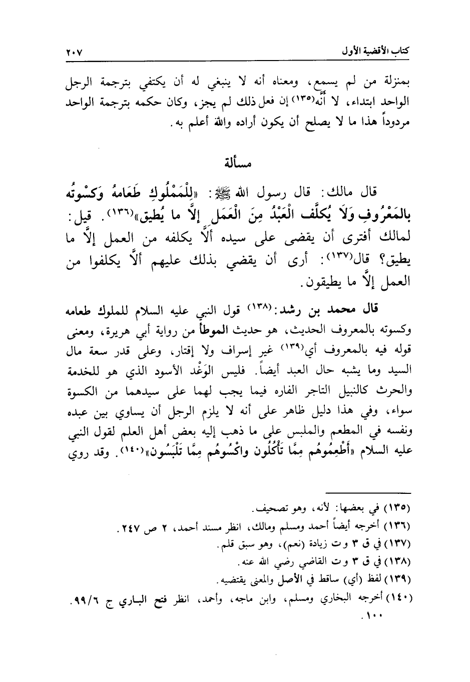 قال محمد بن رشد: قول النبي - عَلَيْهِ السَّلَامُ - «للمملوك طعامه وكسوته بالمعروف» الحديث، هو حديث الموطأ من رواية أبي هريرة، ومعنى قوله فيه بالمعروف أي غير إسراف ولا إقتار، وعلى قدر سعة مال السيد وما يشبه حال العبد أيضا. فليس الوغد الأسود الذي هو للخدمة والحرث كالنبيل التاجر الفاره فيما يجب لهما على سيدهما من الكسوة سواء، وفي هذا دليل ظاهر على أنه لا يلزم الرجل أن يساوي بين عبده ونفسه في المطعم والملبس على ما ذهب إليه بعض أهل العلم لقول النبي - عَلَيْهِ السَّلَامُ -: «أطعموهم مما تأكلون واكسوهم مما تلبسون» . وقد روي