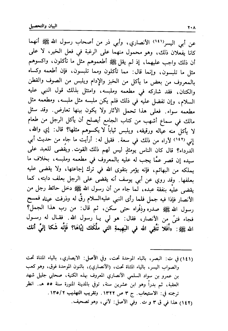 عن أبي اليسر الأنصاري، وأبي ذر من أصحاب رسول الله - صَلَّى اللَّهُ عَلَيْهِ وَسَلَّمَ - أنهما كانا يفعلان ذلك، وهو محمول منهما على الرغبة في فعل الخير، لا على أن ذلك واجب عليهما، إذ لم يقل - صَلَّى اللَّهُ عَلَيْهِ وَسَلَّمَ - أطعموهم مثل ما تأكلون، واكسوهم مثل ما تلبسون، وإنما قال: مما تأكلون ومما تلبسون، فإن أطعمه وكساه بالمعروف من بعض ما يأكل من الخبز والإدام ويلبس من الصوف والقطن والكتان، فقد شاركه في مطعمه وملبسه، وامتثل بذلك قول النبي - عَلَيْهِ السَّلَامُ -، وإن تفضل عليه في ذلك فلم يكن ملبسه مثل ملبسه، ومطعمه مثل مطعمه سواء. فعلى هذا تحمل الآثار ولا يكون بينها تعارض. وقد سئل مالك في سماع أشهب من كتاب الجامع أيصلح أن يأكل الرجل من طعام لا يأكل منه عياله ورقيقه، ويلبس ثيابا لا يكسوهم مثلها؟ قال: إي والله، إني لأراه من ذلك في سعة. فقيل له: أرأيت ما جاء من حديث أبي الدرداء؟ قال: كان الناس يومئذ ليس لهم ذلك القوت. ويقضى للعبد على سيده إن قصر عما يجب له عليه بالمعروف في مطعمه وملبسه، بخلاف ما يملكه من البهائم، فإنه يؤمر بتقوى الله في ترك إجاعتها، ولا يقضى عليه بعلفها. وقد روي عن أبي يوسف أنه يقضى على الرجل بعلف دابته، كما يقضى عليه بنفقة عبده، لما جاء من «أن رسول الله - صَلَّى اللَّهُ عَلَيْهِ وَسَلَّمَ - دخل حائط رجل من الأنصار فإذا فيه جمل فلما رأى النبي - عَلَيْهِ السَّلَامُ - رق له وذرفت عيناه فمسح رسول الله - صَلَّى اللَّهُ عَلَيْهِ وَسَلَّمَ - صدره وذفراه حتى سكن، ثم قال: من رب هذا الجمل؟ فجاء فتى من الأنصار، فقال: هو لي يا رسول الله. فقال له رسول الله - صَلَّى اللَّهُ عَلَيْهِ وَسَلَّمَ -: " أفلا تتقي الله في البهيمة التي ملكك إياها؟ فإنه شكا إلي أنك