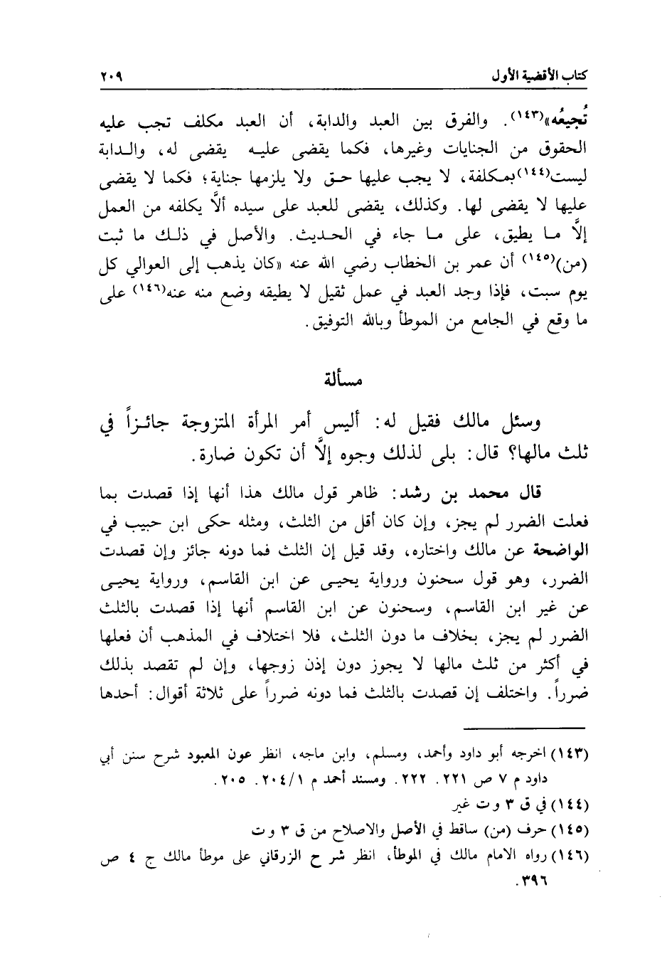 مسألة وسئل مالك فقيل له: أليس أمر المرأة المتزوجة جائزا في ثلث مالها؟ قال: بلى لذلك وجوه إلا أن تكون ضارة.