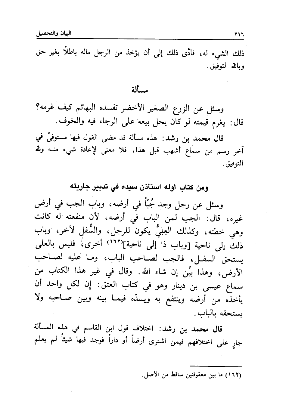 ومن كتاب أوله استأذن سيده في تدبير جاريته وسئل عن رجل وجد جبا في أرضه، وباب الجب في أرض غيره، قال: الجب لمن الباب في أرضه؛ لأن منفعته له كانت وهي خطته، وكذلك العلي يكون للرجل، والسفل لآخر، وباب ذلك إلى ناحية [وباب ذا إلى ناحية] أخرى، فليس بالعلى يستحق السفل، فالجب لصاحب الباب، وما عليه لصاحب الأرض، وهذا بين إن شاء الله. وقال في غير هذا الكتاب من سماع عيسى بن دينار وهو في كتاب العتق: إن لكل واحد أن يأخذه من أرضه وينتفع به ويسده فيما بينه وبين صاحبه ولا يستحقه بالباب.