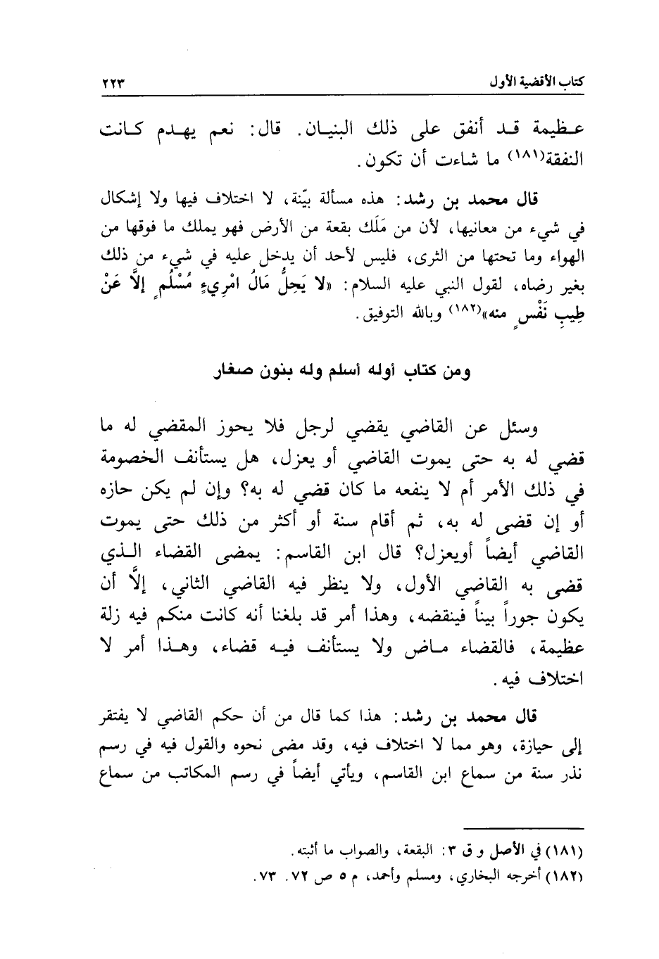 وسئل عن القاضي يقضي لرجل فلا يحوز المقضي له ما قضي له به حتى يموت القاضي أو يعزل، هل يستأنف الخصومة في ذلك الأمر أم لا ينفعه ما كان قضي له به؟ وإن لم يكن حازه أو إن قضى له به، ثم أقام سنة أو أكثر من ذلك حتى يموت القاضي أيضا أو يعزل؟ قال ابن القاسم: يمضي القضاء الذي قضى به القاضي الأول، ولا ينظر فيه القاضي الثاني، إلا أن يكون جورا بينا فينقضه، وهذا أمر قد بلغنا أنه كانت منكم فيه زلة عظيمة، فالقضاء ماض ولا يستأنف فيه قضاء، وهذا أمر لا اختلاف فيه.