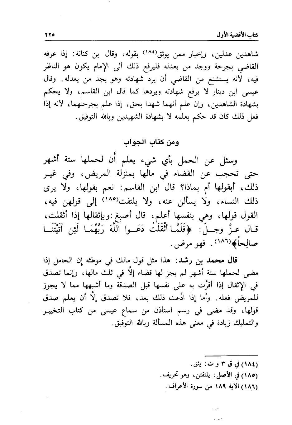 ومن كتاب الجواب وسئل عن الحمل بأي شيء يعلم أن لحملها ستة أشهر حتى تحجب عن القضاء في مالها بمنزلة المريض، وفي غير ذلك، أبقولها أم بماذا؟ قال ابن القاسم: نعم بقولها، ولا يرى ذلك النساء، ولا يسألن عنه، ولا يلتفت إلى قولهن فيه، القول قولها، وهي بنفسها أعلم، قال أصبغ: وبإثقالها إذا أثقلت، قال عز وجل: {فَلَمَّا أَثْقَلَتْ دَعَوَا اللَّهَ رَبَّهُمَا لَئِنْ آتَيْتَنَا صَالِحًا} [الأعراف: 189] . فهو مرض.