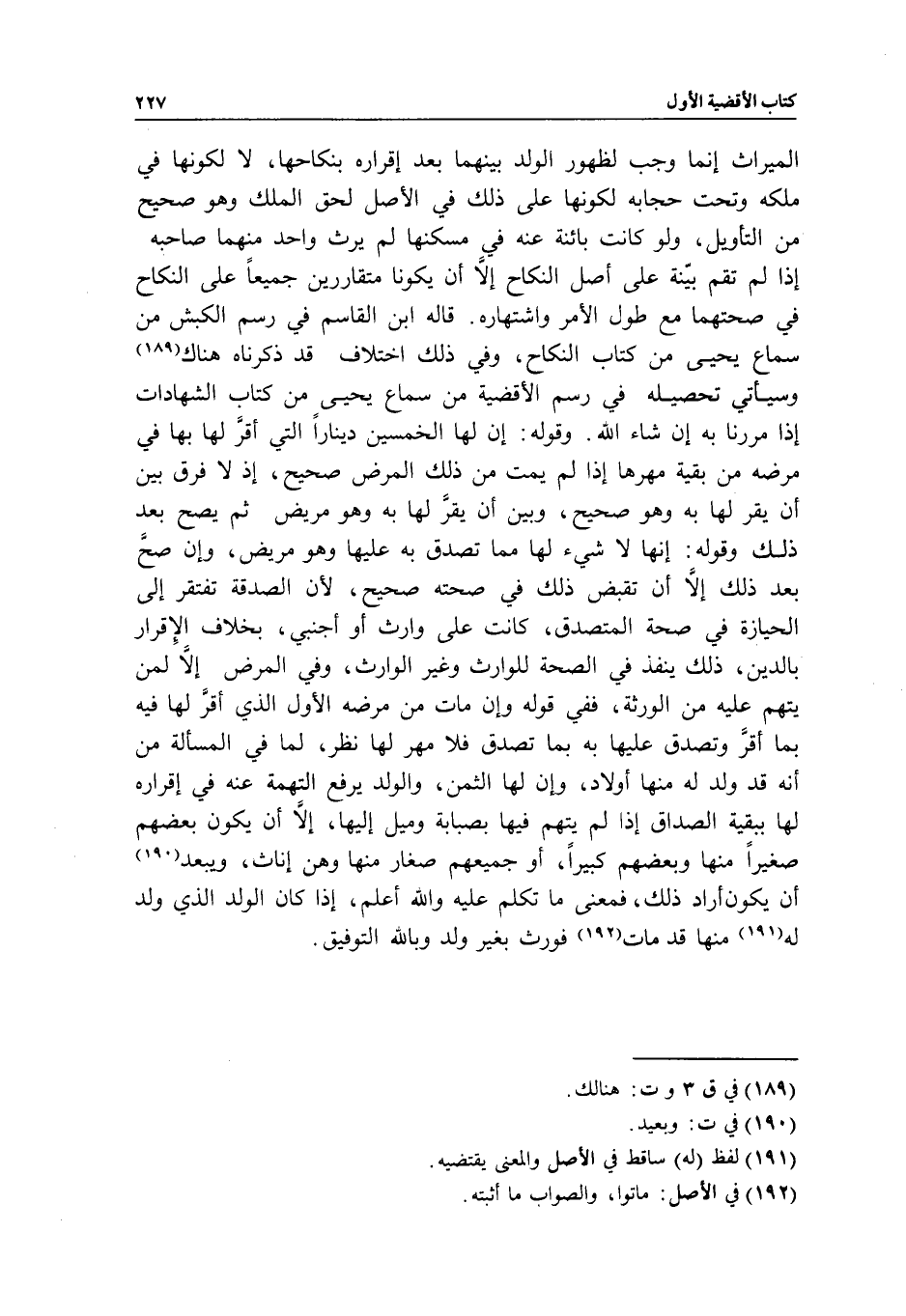 الميراث إنما وجب لظهور الولد بينهما بعد إقراره بنكاحها، لا لكونها في ملكه وتحت حجابه لكونها على ذلك في الأصل لحق الملك وهو صحيح من التأويل، ولو كانت بائنة عنه في مسكنها لم يرث واحد منهما صاحبه إذا لم تقم بينة على أصل النكاح إلا أن يكونا متقاررين جميعا على النكاح في صحتهما مع طول الأمر واشتهاره. قاله ابن القاسم في رسم الكبش من سماع يحيى من كتاب النكاح، وفي ذلك اختلاف قد ذكرناه هناك وسيأتي تحصله في رسم الأقضية من سماع يحيى من كتاب الشهادات إذا مررنا به إن شاء الله. وقوله: إن لها الخمسين دينارا التي أقر لها بها في مرضه من بقية مهرها إذا لم يمت من ذلك المرض صحيح، إذ لا فرق بين أن يقر لها به وهو صحيح، وبين أن يقر لها به وهو مريض ثم يصح بعد ذلك وقوله: إنها لا شيء لها مما تصدق به عليها وهو مريض، وإن صح بعد ذلك إلا أن تقبض ذلك في صحته صحيح؛ لأن الصدقة تفتقر إلى الحيازة في صحة المتصدق، كانت على وارث أو أجنبي، بخلاف الإقرار بالدين، ذلك ينفذ في الصحة للوارث وغير الوارث، وفي المرض إلا لمن يتهم عليه من الورثة، ففي قوله وإن مات من مرضه الأول الذي أقر لها فيه بما أقر وتصدق عليها به بما تصدق فلا مهر لها نظر، لما في المسألة من أنه قد ولد له منها أولاد، وإن لها الثمن، والولد يرفع التهمة عنه في إقراره لها ببقية الصداق إذا لم يتهم فيها بصبابة وميل إليها، إلا أن يكون بعضهم صغيرا منها وبعضهم كبيرا، أو جميعهم صغار منها وهن إناث، ويبعد أن يكون أراد ذلك، فمعنى ما تكلم عليه والله أعلم، إذا كان الولد الذي ولد له منها قد مات فورث بغير ولد وبالله التوفيق.