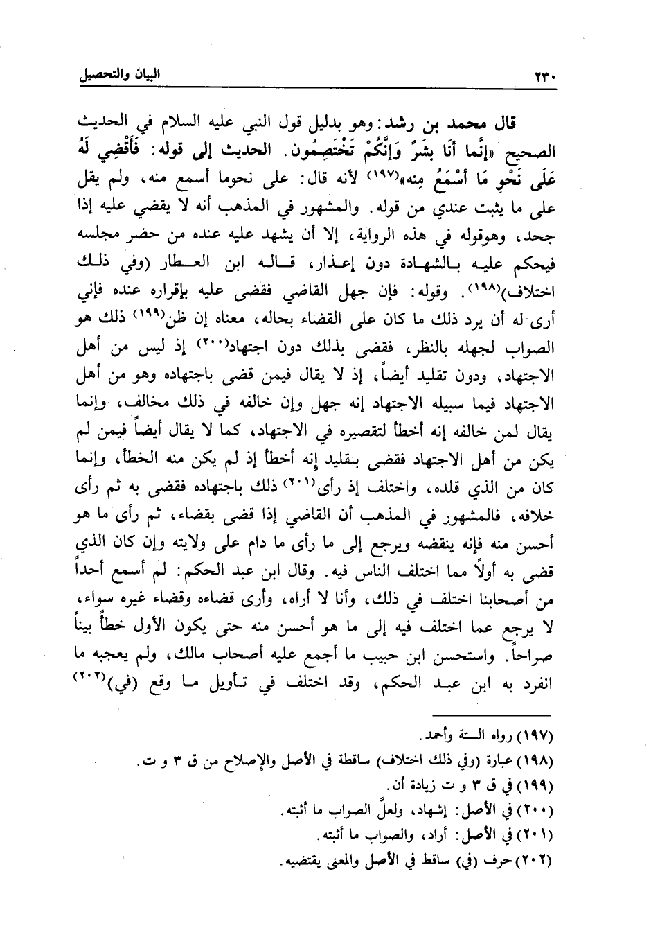 قال محمد بن رشد: وهو بدليل قول النبي - عَلَيْهِ السَّلَامُ - في الحديث الصحيح «إنما أنا بشر وإنكم تختصمون. الحديث إلى قوله: فأقضي له على نحو ما أسمع منه» لأنه قال: على نحو ما أسمع منه، ولم يقل على ما يثبت عندي من قوله. والمشهور في المذهب أنه لا يقضي عليه إذا جحد، وهو قوله في هذه الرواية، إلا أن يشهد عليه عنده من حضر مجلسه فيحكم عليه بالشهادة دون إعذار، قاله ابن العطار (وفي ذلك اختلاف) . وقوله: فإن جهل القاضي فقضى عليه بإقراره عنده فإني أرى له أن يرد ذلك ما كان على القضاء بحاله، معناه إن ظن ذلك هو الصواب لجهله بالنظر، فقضى بذلك دون اجتهاد إذ ليس من أهل الاجتهاد، ودون تقليد أيضا، إذ لا يقال فيمن قضى باجتهاده وهو من أهل الاجتهاد فيما سبيله الاجتهاد إنه جهل وإن خالفه في ذلك مخالف، وإنما يقال لمن خالفه إنه أخطأ لتقصيره في الاجتهاد، كما لا يقال أيضا فيمن لم يكن من الاجتهاد فقضى بتقليد إنه أخطأ إذ لم يكن منه الخطأ، وإنما كان من الذي قلده، واختلف إذ رأى ذلك باجتهاده فقضى به ثم رأى خلافه، فالمشهور في المذهب أن القاضي إذا قضى بقضاء، ثم رأى ما هو أحسن منه فإنه ينقضه ويرجع إلى ما رأى ما دام على ولايته وإن كان الذي قضى به أولا مما اختلف الناس فيه. وقال ابن عبد الحكم: لم أسمع أحدا من أصحابنا اختلف في ذلك، وأنا لا أراه، وأرى قضاءه وقضاء غيره سواء، لا يرجع عما اختلف فيه إلى ما هو أحسن منه حتى يكون الأول خطأ بينا صراحا. واستحسن ابن حبيب ما أجمع عليه أصحاب مالك، ولم يعجبه ما انفرد به ابن عبد الحكم، وقد اختلف في تأويل ما وقع (في)