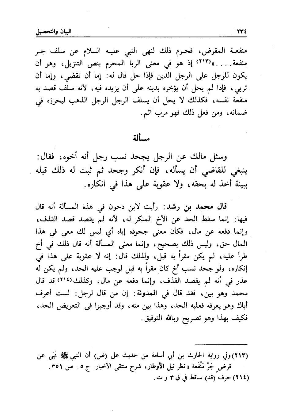 قال محمد بن رشد: رأيت لابن دحون في هذه المسألة أنه قال فيها: إنما سقط الحد عن الأخ المنكر له؛ لأنه لم يقصد قصد القذف، وإنما دفعه عن مال، فكان معنى جحوده إياه أي ليس لك معي في هذا المال حق، وليس ذلك بصحيح، وإنما معنى المسألة أنه قال ذلك في أخ طرأ عليه، لم يكن مقرا به قبل، ولذلك قال: إنه لا عقوبة على هذا في إنكاره، ولو جحد نسب أخ كان مقرا به قبل لوجب عليه الحد، ولم يكن له عذر في أنه لم يقصد القذف، وإنما دفعه عن مال، وكذلك قد قال محمد وهو بين، فقد قال في المدونة: إن من قال لرجل: لست أعرف أباك وهو يعرفه فعليه الحد، وهذا بين منه، وقد أوجبوا في التعريض الحد، فكيف بهذا وهو تصريح وبالله التوفيق.