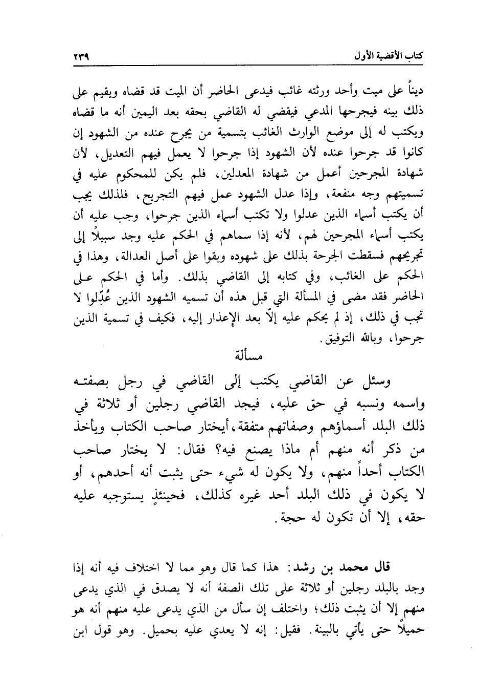 مسألة وسئل عن القاضي يكتب إلى القاضي في رجل بصفته واسمه ونسبه في حق عليه، فيجد القاضي رجلين أو ثلاثة في ذلك البلد أسماؤهم وصفاتهم متفقة، أيختار صاحب الكتاب ويأخذ من ذكر أنه منهم أم ماذا يصنع فيه؟ فقال: لا يختار صاحب الكتاب أحدا منهم، ولا يكون له شيء حتى يثبت أنه أحدهم، أو لا يكون في ذلك البلد أحد غيره كذلك، فحينئذ يستوجبه عليه حقه، إلا أن تكون له حجة.
