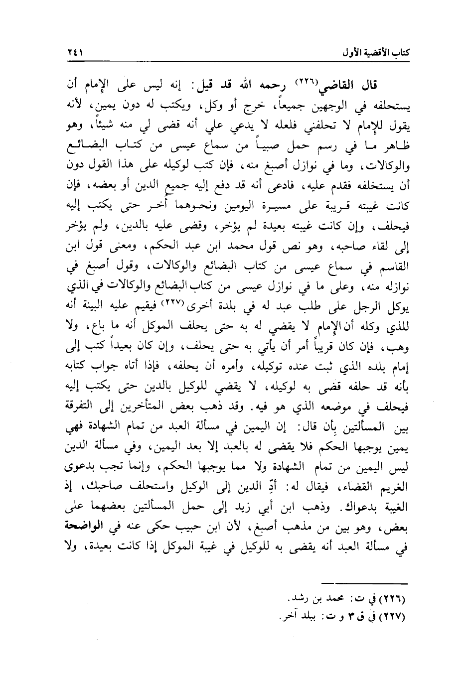 قال القاضي - رَحِمَهُ اللَّهُ - قد قيل: إنه ليس على الإمام أن يستحلفه في الوجهين جميعا خرج أو وكل، ويكتب له دون يمين؛ لأنه يقول للإمام لا تحلفني فلعله لا يدعي علي أنه قضى لي منه شيئا، وهو ظاهر ما في رسم حمل صبيا من سماع عيسى من كتاب البضائع والوكالات، وما في نوازل أصبغ منه، فإن كتب لوكيله على هذا القول دون أن يستخلفه فقدم عليه، فادعى أنه قد دفع إليه جميع الدين أو بعضه، فإن كانت غيبته قريبة على مسيرة اليومين ونحوهما أخر حتى يكتب إليه فيحلف، وإن كانت غيبته بعيدة لم يؤخر، وقضى عليه بالدين، ولم يؤخر إلى لقاء صاحبه، وهو نص قول محمد بن عبد الحكم، ومعنى قول ابن القاسم في سماع عيسى من كتاب البضائع والوكالات، وقول أصبغ في نوازله منه، وعلى ما في نوازل عيسى من كتاب البضائع والوكالات في الذي يوكل الرجل على طلب عبد له في بلدة أخرى فيقيم عليه البينة أنه للذي وكله أن الإمام لا يقضي له به حتى يحلف الموكل أنه ما باع، ولا وهب، فإن كان قريبا أمر أن يأتي به حتى يحلف، وإن كان بعيدا كتب إلى إمام بلده الذي ثبت عنده توكيله، وأمره أن يحلفه، فإذا أتاه جواب كتابه بأنه قد حلفه قضى به لوكيله، لا يقضي للوكيل بالدين حتى يكتب إليه فيحلف في موضعه الذي هو فيه. وقد ذهب بعض المتأخرين إلى التفرقة بين المسألتين بأن قال: إن اليمين في مسألة العبد من تمام الشهادة فهي يمين يوجبها الحكم فلا يقضى له بالعبد إلا بعد اليمين، وفي مسألة الدين ليس اليمين من تمام الشهادة ولا مما يوجبها الحكم، وإنما تجب بدعوى الغريم القضاء، فيقال له: أد الدين إلى الوكيل واستحلف صاحبك، إذ الغيبة بدعواك. وذهب ابن أبي زيد إلى حمل المسألتين بعضهما على بعض، وهو بين من مذهب أصبغ؛ لأن ابن حبيب حكى عنه في الواضحة في مسألة العبد أنه يقضى به للوكيل في غيبة الموكل إذا كانت بعيدة، ولا
