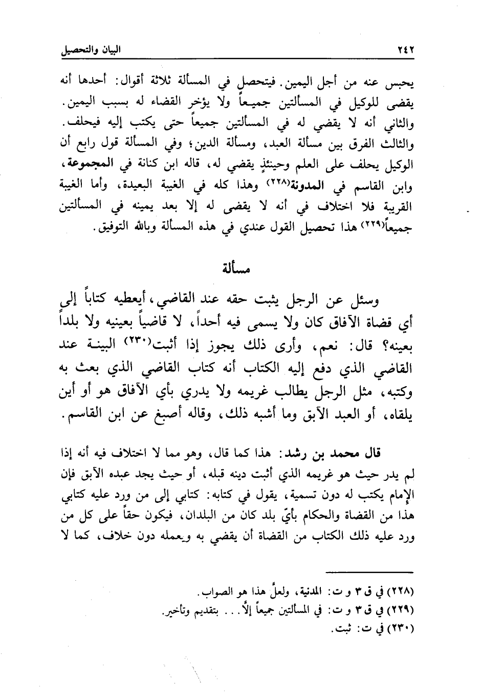 يحبس عنه من أجل اليمين. فيتحصل في المسألة ثلاثة أقوال: أحدها أنه يقضى للوكيل في المسألتين جميعا ولا يؤخر القضاء له بسبب اليمين. والثاني أنه لا يقضي له في المسألتين جميعا حتى يكتب إليه فيحلف. والثالث الفرق بين مسألة العبد، ومسألة الدين؛ وفي المسألة قول رابع أن الوكيل يحلف على العلم وحينئذ يقضي له، قاله ابن كنانة في المجموعة، وابن القاسم في المدونة وهذا كله في الغيبة البعيدة، وأما الغيبة القريبة فلا اختلاف في أنه لا يقضى له إلا بعد يمينه في المسألتين جميعا هذا تحصيل القول عندي في هذه المسألة وبالله التوفيق.