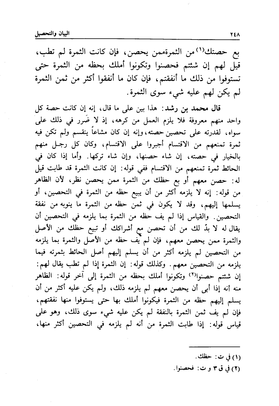قال محمد بن رشد: هذا بين على ما قال، إنه إن كانت حصة كل واحد منهم معروفة فلا يلزم العمل من كرهه، إذ لا ضرر في ذلك على سواه، لقدرته على تحصين حصته، وإنه إن كان مشاعا ينقسم ولم تكن فيه ثمرة تمنعهم من الاقتسام أجبروا على الاقتسام، وكان كل رجل منهم بالخيار في حصته، إن شاء حصنها، وإن شاء تركها. وأما إذا كان في الحائط ثمرة تمنعهم من الاقتسام ففي قوله: إن كانت الثمرة قد طابت قيل له: حصن معهم أو بع حظك من الثمرة ممن يحصن نظر؛ لأن الظاهر من قوله: إنه لا يلزمه أكثر من أن يبيع حظه من الثمرة في التحصين، أو يسلمها إليهم، وقد لا يكون في ثمن حظه من الثمرة ما ينوبه من نفقة التحصين. والقياس إذا لم يف حظه من الثمرة بما يلزمه في التحصين أن يقال له: لا بد لك من أن تحصن مع أشراكك أو تبيع حظك من الأصل والثمرة ممن يحصن معهم، فإن لم يف حظه من الأصل والثمرة بما يلزمه من التحصين لم يلزمه أكثر من أن يسلم إليهم أصل الحائط بثمرته فيما يلزمه من التحصين معهم. وكذلك قوله: إن الثمرة إذا لم تطب يقال لهم: إن شئتم حصنوا وتكونوا أملك بحظه من الثمرة إلى آخر قوله: الظاهر منه أنه إذا أبى أن يحصن معهم لم يلزمه ذلك، ولم يكن عليه أكثر من أن يسلم إليهم حظه من الثمرة فيكونوا أملك بها حتى يستوفوا منها نفقتهم، فإن لم يف ثمن الثمرة بالنفقة لم يكن عليه شيء سوى ذلك، وهو على قياس قوله: إذا طابت الثمرة من أنه لم يلزمه في التحصين أكثر منها،