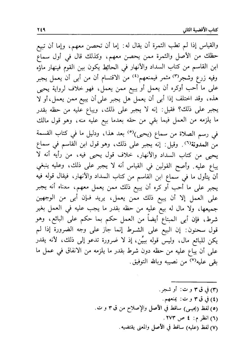 والقياس إذا لم تطب الثمرة أن يقال له: إما أن تحصن معهم، وإما أن تبيع حظك من الأصل والثمرة ممن يحصن معهم، وكذلك قال في أول سماع ابن القاسم من كتاب السداد والأنهار في الحائط يكون بين القوم فينهار ماؤه وفيه زرع وشجر مثمر فيمنعهم من الاقتسام أن من أبى أن يعمل يجبر على ما أحب أو كره أن يعمل أو يبيع ممن يعمل، فهو خلاف لرواية يحيى هذه، وقد اختلف إذا أبى أن يعمل هل يجبر على أن يبيع ممن يعمل، أو لا يجبر على ذلك؟ فقيل: إنه يجبر على ذلك، ويباع عليه من حظه بقدر ما يلزمه من العمل فيما بقي من حقه بعدما بيع عليه منه، وهو قول مالك في رسم الصلاة من سماع (يحيى) بعد هذا، ودليل ما في كتاب القسمة من المدونة. وقيل: إنه يجبر على ذلك، وهو قول ابن القاسم في سماع يحيى من كتاب السداد والأنهار، خلاف قول يحيى فيه، من رأيه أنه لا يباع عليه. وأصح القولين في القياس أنه لا يجبر على ذلك، وعليه ينبغي أن يتأول ما في سماع ابن القاسم من كتاب السداد والأنهار، فيقال قوله فيه يجبر على ما أحب أو كره أن يبيع ذلك ممن يعمل معهم، معناه أنه يجبر على العمل إلا أن يبيع ذلك ممن يعمل، يريد فإن أبى من الوجهين جميعها، ولا مال له بيع عليه من حظه بقدر ما يجب عليه في العمل بغير شرط، فإن أبى المبتاع أيضا من العمل حكم بما حكم على البائع، وهو قول سحنون: إن البيع على الشرط إنما جاز على وجه الضرورة إذا لم يكن للبائع مال، وليس قوله ببين، إذ لا ضرورة تدعو إلى ذلك؛ لأنه يقدر على أن يباع عليه من حظه دون شرط بقدر ما يلزمه من الإنفاق في عمل ما بقي عليه من نصيبه وبالله التوفيق.