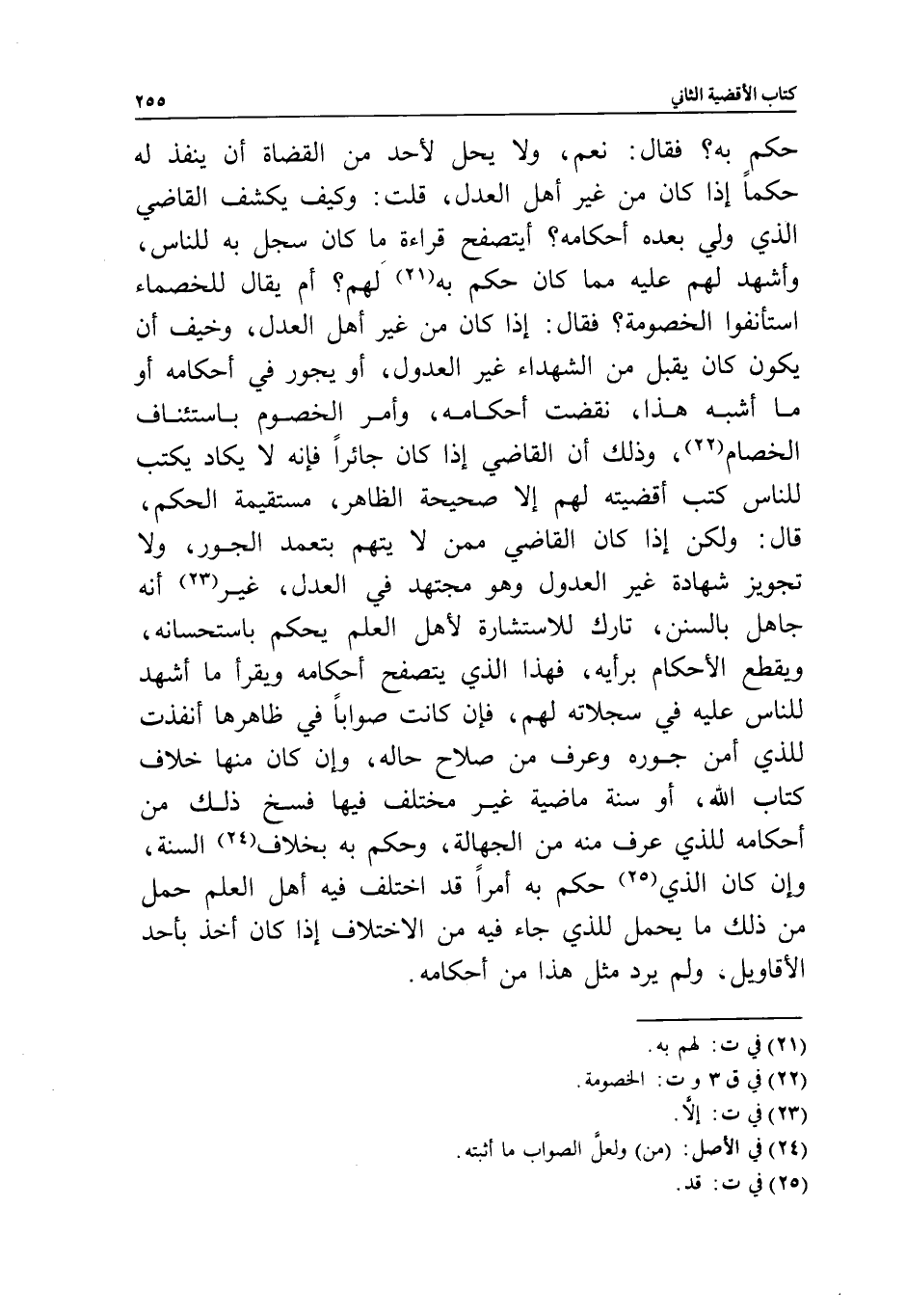 حكم به؟ فقال: نعم، ولا يحل لأحد من القضاة أن ينفذ له حكما إذا كان من غير أهل العدل، قلت: وكيف يكشف القاضي الذي ولي بعده أحكامه؟ أيتصفح قراءة ما كان سجل به للناس، وأشهد لهم عليه مما كان حكم به لهم؟ أم يقال للخصماء: استأنفوا الخصومة؟ فقال: إذا كان من غير أهل العدل، وخيف أن يكون كان يقبل من الشهداء غير العدول، أو يجور في أحكامه أو ما أشبه هذا، نقضت أحكامه، وأمر الخصوم باستئناف الخصام، وذلك أن القاضي إذا كان جائرا فإنه لا يكاد يكتب للناس كتب أقضيته لهم إلا صحيحة الظاهر، مستقيمة الحكم، قال: ولكن إذا كان القاضي ممن لا يتهم بتعمد الجور، ولا تجويز شهادة غير العدول وهو مجتهد في العدل، غير أنه جاهل بالسنن، تارك للاستشارة لأهل العلم يحكم باستحسانه، ويقطع الأحكام برأيه، فهذا الذي يتصفح أحكامه ويقرأ ما أشهد للناس عليه في سجلاته لهم، فإن كانت صوابا في ظاهرها أنفذت للذي أمن جوره وعرف من صلاح حاله، وإن كان منها خلاف كتاب الله، أو سنة ماضية غير مختلف فيها فسخ ذلك من أحكامه للذي عرف منه من الجهالة، وحكم به بخلاف السنة، وإن كان الذي حكم به أمرا قد اختلف فيه أهل العلم حمل من ذلك ما يحمل للذي جاء فيه من الاختلاف إذا كان أخذ بأحد الأقاويل، ولم يرد مثل هذا من أحكامه.