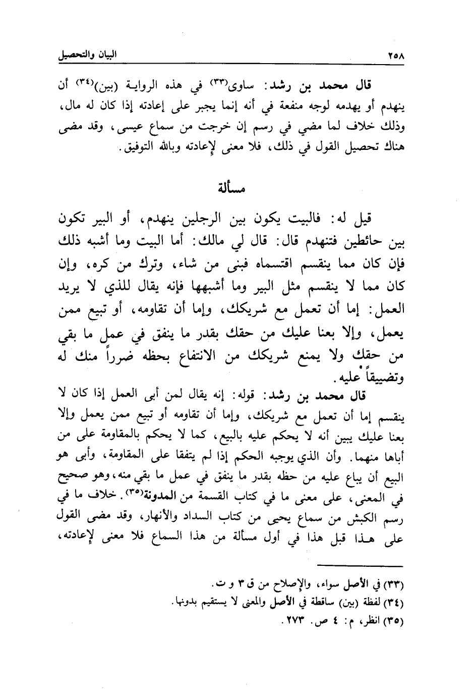 مسألة قيل له: فالبيت يكون بين الرجلين ينهدم، أو البير تكون بين حائطين فتنهدم قال: قال لي مالك: أما البيت وما أشبه ذلك، فإن كان مما ينقسم اقتسماه فبنى من شاء، وترك من كره، وإن كان مما لا ينقسم مثل البير وما أشبهها، فإنه يقال للذي لا يريد العمل: إما أن تعمل مع شريكك، وإما أن تقاومه، أو تبيع ممن يعمل، وإلا بعنا عليك من حقك بقدر ما ينفق في عمل ما بقي من حقك، ولا يمنع شريكك من الانتفاع بحظه ضررا منك له وتضييقا عليه.