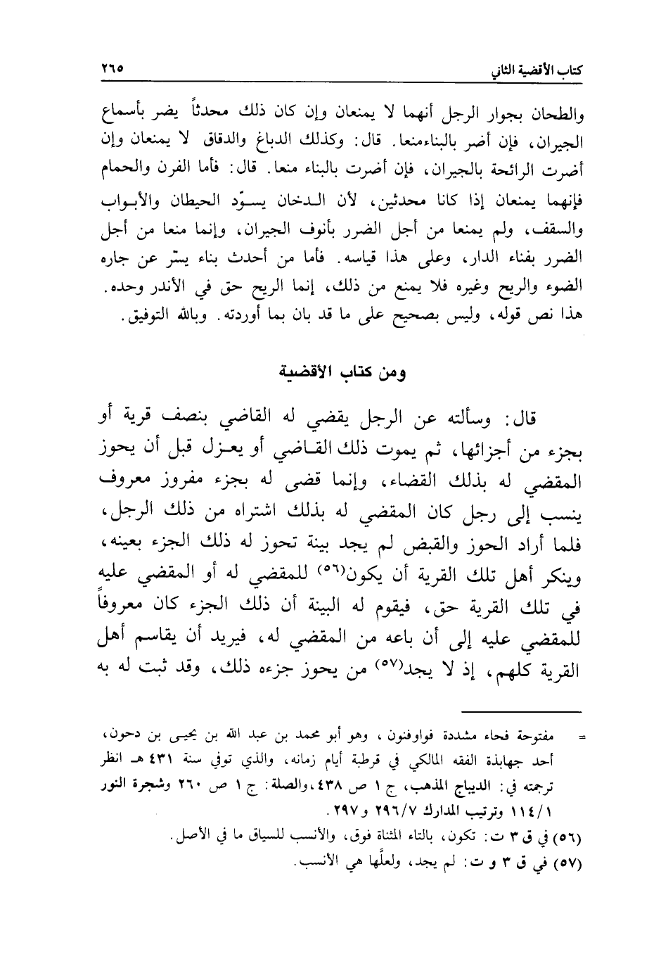 قال: وكذلك الدباغ والدقاق لا يمنعان، وإن أضرت الرائحة بالجيران، فإن أضرت بالبناء منعا. قال: فأما الفرن والحمام فإنهما يمنعان إذا كانا محدثين؛ لأن الدخان يسود الحيطان والأبواب والسقف، ولم يمنعا من أجل الضرر بأنوف الجيران، وإنما منعا من أجل الضرر بفناء الدار، وعلى هذا قياسه. فأما من أحدث بناء يستر عن جاره الضوء والريح وغيره، فلا يمنع من ذلك، إنما الريح حق في الأندر وحده. هذا نص قوله، وليس بصحيح على ما قد بان بما أوردته، وبالله التوفيق.