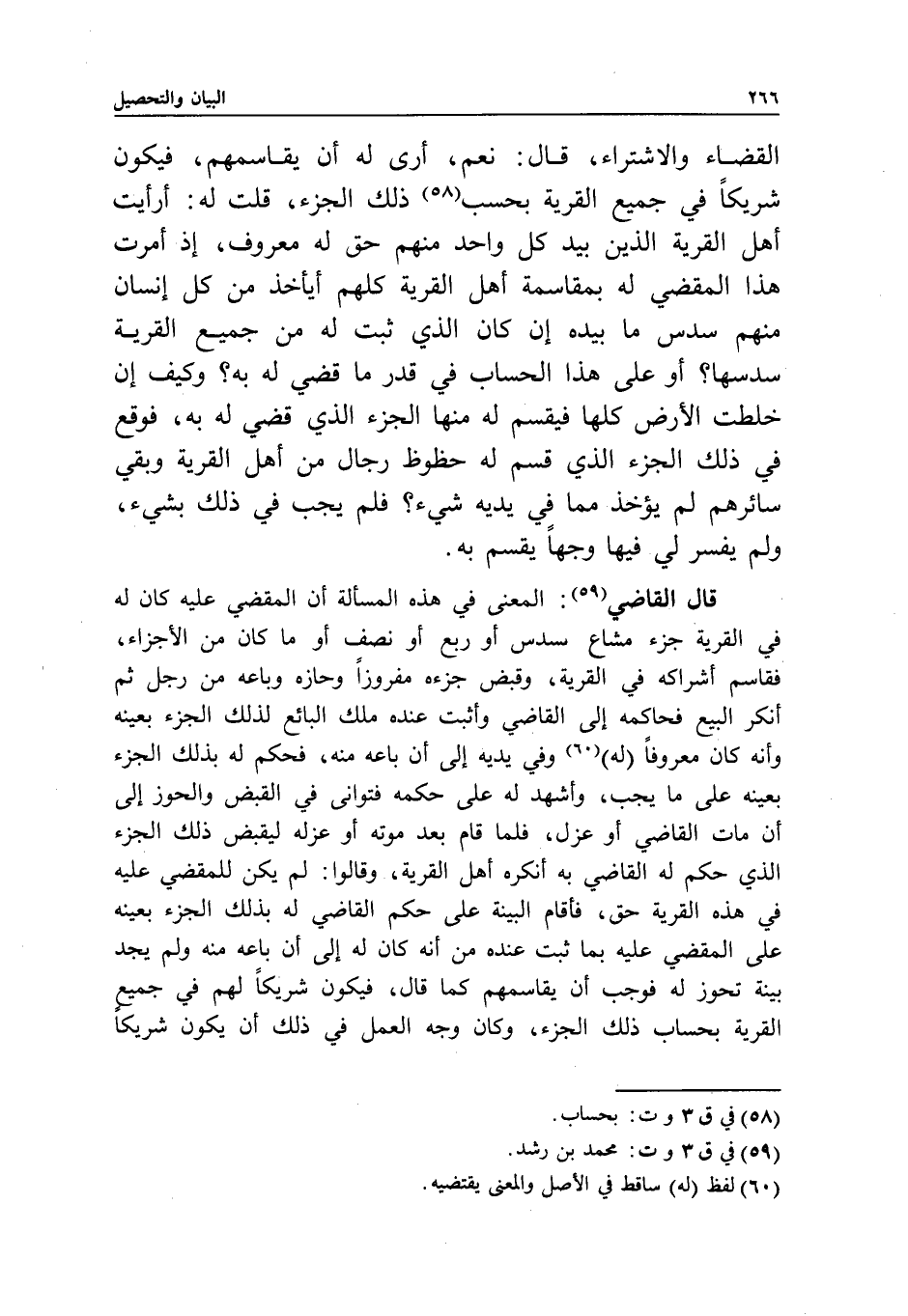القضاء والاشتراء، قال: نعم، أرى له أن يقاسمهم، فيكون شريكا في جميع القرية بحسب ذلك الجزء، قلت له: أرأيت أهل القرية الذين بيد كل واحد منهم حق له معروف؛ إذ أمرت هذا المقضي له بمقاسمة أهل القرية كلهم أيأخذ من كل إنسان منهم سدس ما بيده إن كان الذي ثبت له من جميع القرية سدسها؟ أو على هذا الحساب في قدر ما قضي له به؟ وكيف إن خلطت الأرض كلها، فيقسم له منها الجزء الذي قضي له به، فوقع في ذلك الجزء الذي قسم له حظوظ رجال من أهل القرية، وبقي سائرهم لم يؤخذ مما في يديه شيء؟ فلم يجب في ذلك بشيء، ولم يفسر لي فيها وجها يقسم به.