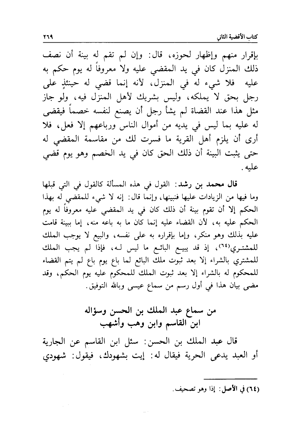 بإقرار منهم وإظهار لحوزه، قال: وإن لم تقم له بينة أن نصف ذلك المنزل كان في يد المقضي عليه، ولا معروفا له يوم حكم به عليه، فلا شيء له في المنزل؛ لأنه إنما قضي له حينئذ على رجل بحق لا يملكه، وليس بشريك لأهل المنزل فيه، ولو جاز مثل هذا عند القضاة لم يشأ رجل أن يصنع لنفسه خصما، فيقضى له عليه بما ليس في يديه من أموال الناس ورباعهم إلا فعل، فلا أرى أن يلزم أهل القرية ما فسرت لك من مقاسمة المقضي له، حتى يثبت البينة أن ذلك الحق كان في يد الخصم وهو يوم قضي عليه.