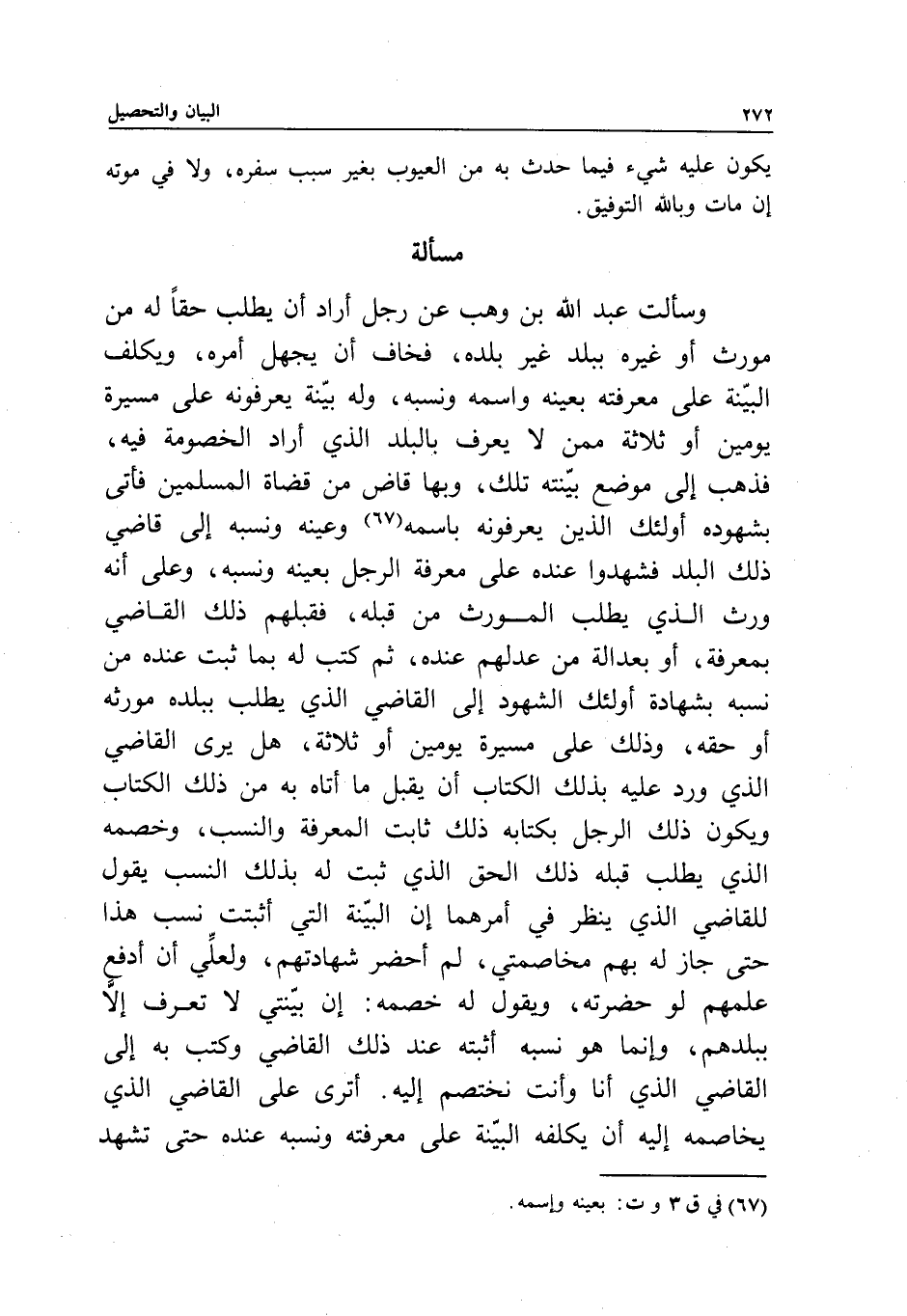مسألة وسألت عبد الله بن وهب عن رجل أراد أن يطلب حقا له من مورث أو غيره ببلد غير بلده، فخاف أن يجهل أمره، ويكلف البينة على معرفته بعينه واسمه ونسبه، وله بينة يعرفونه على مسيرة يومين أو ثلاثة، ممن لا يعرف بالبلد الذي أراد الخصومة فيه، فذهب إلى موضع بينته تلك، وبها قاض من قضاة المسلمين، فأتى بشهوده أولئك الذين يعرفونه باسمه وعينه، ونسبه إلى قاضي ذلك البلد، فشهدوا عنده على معرفة الرجل بعينه ونسبه، وعلى أنه ورث الذي يطلب المورث من قبله، فقبلهم ذلك القاضي بمعرفة، أو بعدالة من عدلهم عنده، ثم كتب له بما ثبت عنده من نسبه بشهادة أولئك الشهود إلى القاضي الذي يطلب ببلده مورثه أو حقه، وذلك على مسيرة يومين أو ثلاثة، هل يرى القاضي الذي ورد عليه بذلك الكتاب أن يقبل ما أتاه به من ذلك الكتاب، ويكون ذلك الرجل بكتابه ذلك ثابت المعرفة والنسب، وخصمه الذي يطلب قبله ذلك الحق الذي ثبت له بذلك النسب، يقول للقاضي الذي ينظر في أمرهما: إن البينة التي أثبتت نسب هذا حتى جاز له بهم مخاصمتي، لم أحضر شهادتهم، ولعلي أن أدفع علمهم لو حضرته، ويقول له خصمه: إن بينتي لا تعرف إلا ببلدهم، وإنما هو نسبه أثبته عند ذلك القاضي، وكتب به إلى القاضي الذي أنا وأنت نختصم إليه؛ أترى على القاضي الذي يخاصمه إليه أن يكلفه البينة على معرفته ونسبه عنده، حتى تشهد