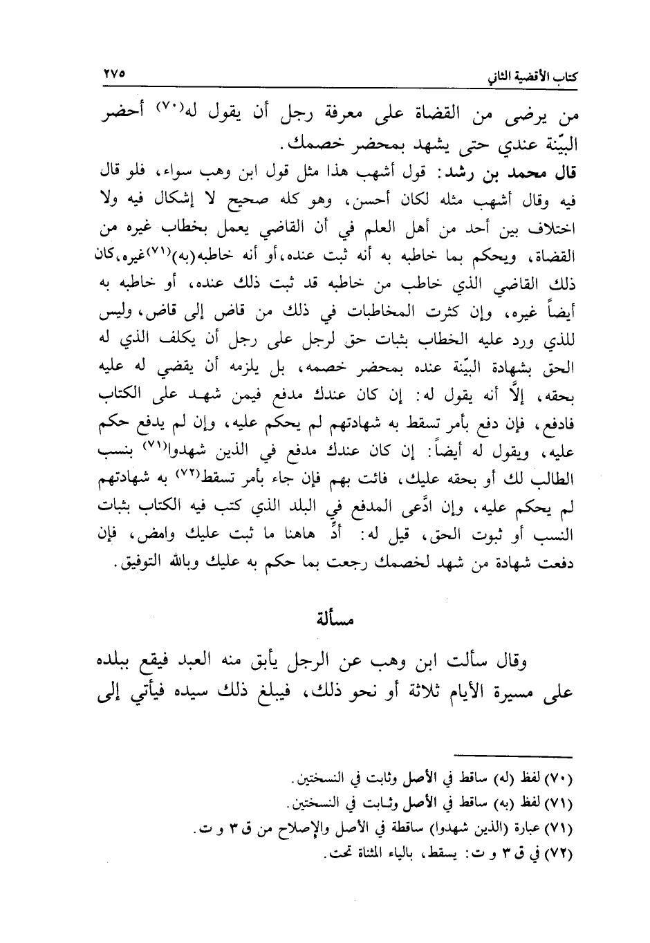 قال محمد بن رشد: قول أشهب هذا مثل قول ابن وهب سواء، فلو قال فيه: وقال أشهب مثله؛ لكان أحسن، وهو كله صحيح لا إشكال فيه، ولا اختلاف بين أحد من أهل العلم في أن القاضي يعمل بخطاب غيره من القضاة، ويحكم بما خاطبه به أنه ثبت عنده، أو أنه خاطبه به غيره، كان ذلك القاضي الذي خاطب من خاطبه قد ثبت ذلك عنده، أو خاطبه به أيضا غيره، وإن كثرت المخاطبات في ذلك من قاض إلى قاض، وليس للذي ورد عليه الخطاب بثبات حق لرجل على رجل أن يكلف الذي له الحق بشهادة البينة عنده بمحضر خصمه، بل يلزمه أن يقضي له عليه بحقه، إلا أنه يقول له: إن كان عندك مدفع فيمن شهد على الكتاب فادفع، فإن دفع بأمر تسقط به شهادتهم لم يحكم عليه، وإن لم يدفع حكم عليه، ويقول له أيضا: إن كان عندك مدفع في الذين شهدوا بنسب الطالب لك أو بحقه عليك، فائت بهم، فإن جاء بأمر تسقط به شهادتهم لم يحكم عليه، وإن ادعى المدفع في البلد الذي كتب فيه الكتاب بثبات النسب أو ثبوت الحق، قيل له: أد هاهنا ما ثبت عليك وامض، فإن دفعت شهادة من شهد لخصمك رجعت بما حكم به عليك، وبالله التوفيق.