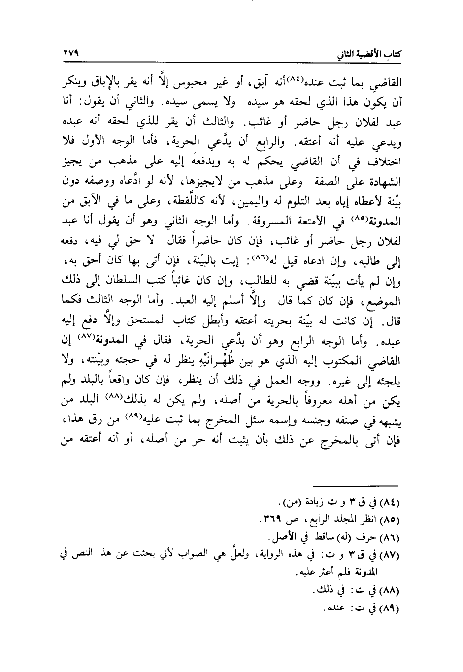القاضي بما ثبت عنده أنه آبق، أو غير محبوس إلا أنه يقر بالإباق، وينكر أن يكون هذا الذي لحقه هو سيده ولا يسمى سيده. والثاني: أن يقول: أنا عبد لفلان رجل حاضر أو غائب. والثالث: أن يقر للذي لحقه أنه عبده، ويدعي عليه أنه أعتقه. والرابع: أن يدعي الحرية.