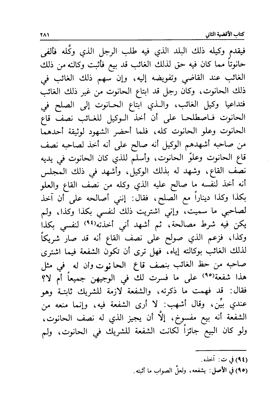 فيقدم وكيله ذلك البلد الذي فيه طلب الرجل الذي وكله، فألفى حانوتا مما كان فيه حق لذلك الغائب قد بيع، فأثبت وكالته من ذلك الغائب عند القاضي وتفويضه إليه، وإن سهم ذلك الغائب في ذلك الحانوت، وكان رجل قد ابتاع الحانوت من غير ذلك الغائب، فتداعيا وكيل الغائب، والذي ابتاع الحانوت إلى الصلح في الحانوت فاصطلحا على أن أخذ الوكيل للغائب نصف قاع الحانوت وعلو الحانوت كله، فلما أحضر الشهود لوثيقة أحدهما من صاحبه، أشهدهم الوكيل أنه صالح على أنه أخذ لصاحبه نصف قاع الحانوت وعلو الحانوت، وأسلم للذي كان الحانوت في يديه نصف القاع، وشهد له بذلك الوكيل، وأشهد في ذلك المجلس أنه أخذ لنفسه ما صالح عليه الذي وكله من نصف القاع والعلو بكذا وكذا دينارا مع الصلح، فقال: إنني أصالحه على أن آخذ لصاحبي ما سميت، وإني اشتريت ذلك لنفسي بكذا وكذا، ولم يكن فيه شرط مصالحة، ثم أشهد أني أخذته لنفسي بكذا وكذا، فزعم الذي صولح على نصف القاع أنه قد صار شريكا لذلك الغائب بوكالته إياه، فهل ترى أن تكون الشفعة فيما اشترى صاحبه من حظ الغائب بنصف قاع الحانوت، وأن له في مثل هذا شفعة على ما فسرت لك في الوجهين جميعا أم لا؟ فقال: قد فهمت ما ذكرته، والشفعة لازمة للشريك ثابتة وهو عندي بين، وقال أشهب: لا أرى الشفعة فيه، وإنما منعه من الشفعة أنه بيع مفسوخ، إلا أن يجيز الذي له نصف الحانوت، ولو كان البيع جائزا؛ لكانت الشفعة للشريك في الحانوت، ولم