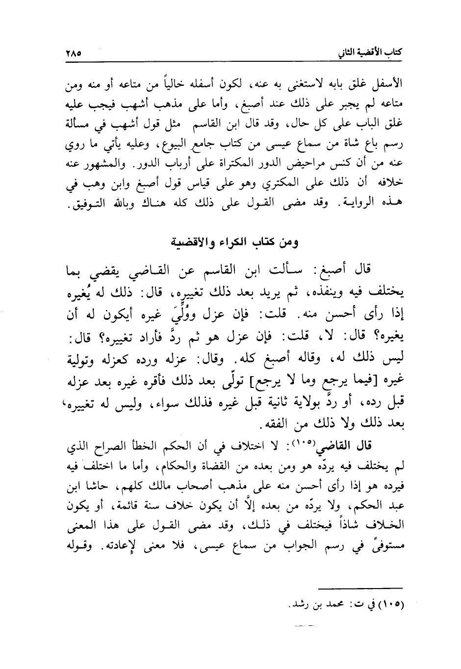 ومن كتاب الكراء والأقضية قال أصبغ: سألت ابن القاسم عن القاضي يقضي بما يختلف فيه وينفذه، ثم يريد بعد ذلك تغييره، قال: ذلك له يغيره إذا رأى أحسن منه. قلت: فإن عزل وولي غيره أيكون له أن يغيره؟ قال: لا، قلت: فإن عزل هو ثم رد، فأراد تغييره؟ قال: ليس ذلك له، وقاله أصبغ كله. وقال: عزله ورده كعزله وتولية غيره فيما يرجع وما لا يرجع، تولى بعد ذلك فأقره غيره بعد عزله قبل رده، أو رد بولاية ثانية قبل غيره، فذلك سواء، وليس له تغييره بعد ذلك، ولا ذلك من الفقه.
