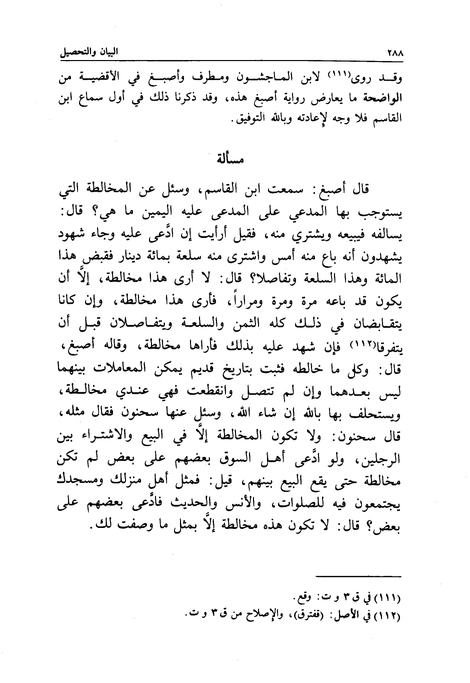 مسألة قال أصبغ: سمعت ابن القاسم، وسئل عن المخالطة التي يستوجب بها المدعي على المدعى عليه اليمين ما هي؟ قال: يسالفه فيبيعه ويشتري منه، فقيل: أرأيت إن ادعى عليه وجاء شهود يشهدون أنه باع منه أمس، واشترى منه سلعة بمائة دينار، فقبض هذا المائة وهذا السلعة وتفاصلا؟ قال: لا أرى هذا مخالطة، إلا أن يكون قد باعه مرة ومرة ومرارا، فأرى هذا مخالطة، وإن كانا يتقابضان في ذلك كله الثمن والسلعة، ويتفاصلان قبل أن يتفرقا، فإن شهد عليه بذلك فأراها مخالطة، وقاله أصبغ، قال: وكل ما خالطه فثبت بتاريخ قديم يمكن المعاملات بينهما، ليس بعدهما، وإن لم تتصل وانقطعت فهي عندي مخالطة، ويستحلف بها بالله إن شاء الله، وسئل عنها سحنون فقال مثله، قال سحنون: ولا تكون المخالطة إلا في البيع والاشتراء بين الرجلين، ولو ادعى أهل السوق بعضهم على بعض لم تكن مخالطة حتى يقع البيع بينهم، قيل: فمثل أهل منزلك ومسجدك يجتمعون فيه للصلوات والأنس والحديث، فادعى بعضهم على بعض؟ قال: لا تكون هذه مخالطة إلا بمثل ما وصفت لك.