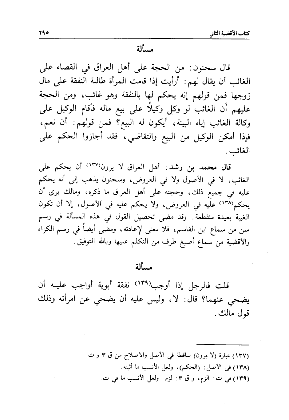 مسألة قال سحنون: من الحجة على أهل العراق في القضاء على الغائب أن يقال لهم: أرأيت إذا قامت المرأة طالبة النفقة على مال زوجها، فمن قولهم: إنه يحكم لها بالنفقة وهو غائب، ومن الحجة عليهم أن الغائب لو وكل وكيلا على بيع ماله، فأقام الوكيل على وكالة الغائب إياه البينة، أيكون له البيع؟ فمن قولهم: أن نعم، فإذا أمكن الوكيل من البيع والتقاضي، فقد أجازوا الحكم على الغائب.