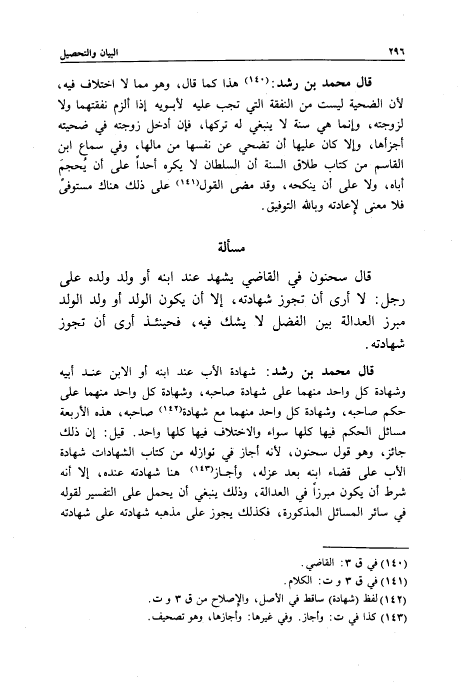 قال محمد بن رشد: شهادة الأب عند ابنه، أو الابن عند أبيه، وشهادة كل واحد منهما على شهادة صاحبه، وشهادة كل واحد منهما على حكم صاحبه، وشهادة كل واحد منهما مع شهادة صاحبه، هذه الأربعة مسائل الحكم فيها كلها سواء، والاختلاف فيها كلها واحد. قيل: إن ذلك جائز، وهو قول سحنون؛ لأنه أجاز في نوازله من كتاب الشهادات شهادة الأب على قضاء ابنه بعد عزله، وأجاز هنا شهادته عنده، إلا أنه شرط أن يكون مبرزا في العدالة، وذلك ينبغي أن يحمل على التفسير؛ لقوله في سائر المسائل المذكورة، فكذلك يجوز على مذهبه شهادته على شهادته،