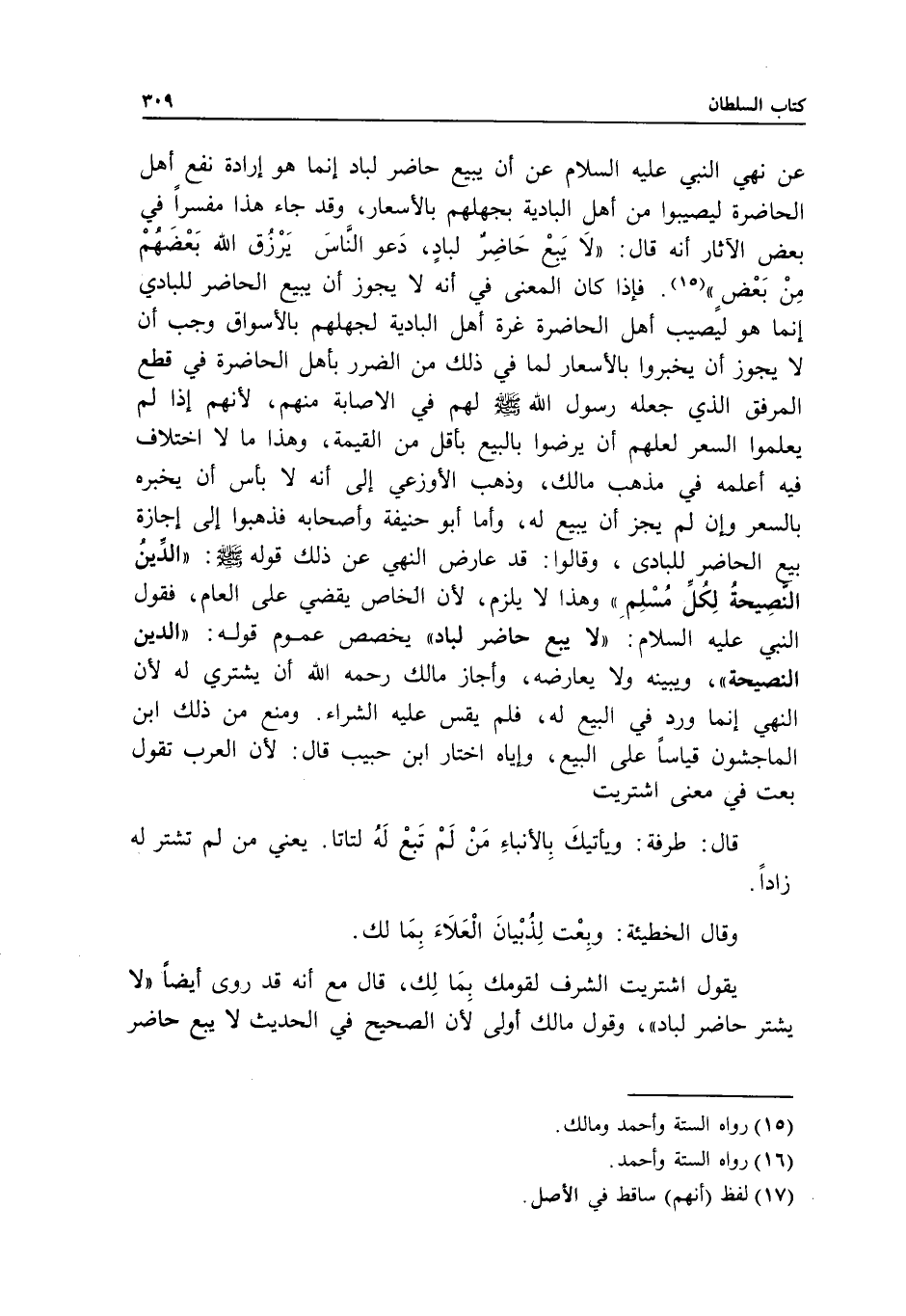 عن نهي النبي - عَلَيْهِ السَّلَامُ - عن أن يبيع حاضر لباد، إنما هو إرادة نفع أهل الحاضرة ليصيبوا من أهل البادية بجهلهم بالأسعار، وقد جاء هذا مفسرا في بعض الآثار أنه قال: «لا يبع حاضر لباد، دعوا الناس، يرزق الله بعضهم من بعض» . فإذا كان المعنى في أنه لا يجوز أن يبيع الحاضر للبادي، إنما هو ليصيب أهل الحاضرة غرة أهل البادية لجهلهم بالأسواق، وجب أن لا يجوز أن يخبروا بالأسعار لما في ذلك من الضرر بأهل الحاضرة في قطع المرفق الذي جعله رسول الله - صَلَّى اللَّهُ عَلَيْهِ وَسَلَّمَ - لهم في الإصابة منهم؛ لأنهم إذا لم يعلموا السعر لعلهم أن يرضوا بالبيع بأقل من القيمة، وهذا ما لا اختلاف فيه أعلمه في مذهب مالك، وذهب الأوزاعي إلى أنه لا بأس أن يخبره بالسعر، وإن لم يجز أن يبيع له، وأما أبو حنيفة وأصحابه فذهبوا إلى إجازة بيع الحاضر للبادي، وقالوا: قد عارض النهي عن ذلك قوله - صَلَّى اللَّهُ عَلَيْهِ وَسَلَّمَ -: «الدين النصيحة لكل مسلم» وهذا لا يلزم؛ لأن الخاص يقضي على العام، فقول النبي - عَلَيْهِ السَّلَامُ -: «لا يبع حاضر لباد» يخصص عموم قوله: «الدين النصيحة» ، ويبينه ولا يعارضه، وأجاز مالك - رَحِمَهُ اللَّهُ - أن يشتري له؛ لأن النهي إنما ورد في البيع له، فلم يقس عليه الشراء، ومنع من ذلك ابن الماجشون قياسا على البيع، وإياه اختار ابن حبيب قال: لأن العرب تقول بعت في معنى اشتريت.