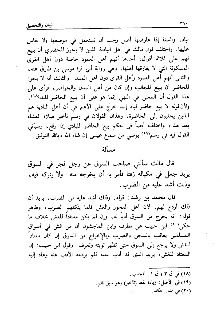 لباد» ، والسنة إذا عارضها أصل وجب أن تستعمل في موضعها، ولا يقاس عليها. واختلف قول مالك في أهل البادية الذين لا يجوز للحضري أن يبيع لهم على ثلاثة أقوال؛ أحدها: أنهم أهل العمود خاصة دون أهل القرى المسكونة التي لا يفارقها أهلها، وهي رواية أبي قرة موسى بن طارق عنه. والثاني: أنهم أهل العمود، وأهل القرى دون أهل المدن. والثالث: أنه لا يجوز للحاضر أن يبيع للجالب، وإن كان من أهل المدن والحواضر، فرأى على هذا القول أن المعنى في النهي إنما هو على أن يبيع الحاضر للباد؛ ولأن قوله: «لا يبع حاضر لباد» ، إنما خرج على الأعم في أن أهل البادية هم الذين يجلبون إلى الحاضرة، وهذان القولان في رسم تأخير صلاة العشاء بعد هذا، واختلف أيضا في حكم بيع الحاضر للبادي إذا وقع، وسيأتي القول فيه في رسم يوصي، من سماع عيسى إن شاء الله، وبالله التوفيق.