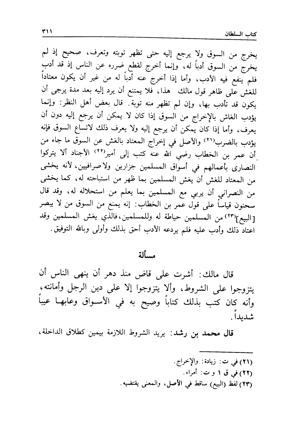 مسألة قال مالك: أشرت على قاض منذ دهر أن ينهى الناس أن يتزوجوا على الشروط، وألا يتزوجوا إلا على دين الرجل وأمانته، وأنه كان كتب بذلك كتابا، وصيح به في الأسواق وعابها عيبا شديدا.