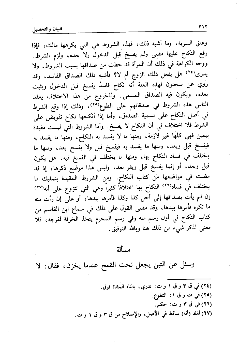 وعتق السرية، وما أشبه ذلك، فهذه الشروط هي التي يكرهها مالك، فإذا وقع النكاح عليها مضى، ولم يفسخ قبل الدخول ولا بعده، ولزم الشرط. ووجه الكراهة في ذلك أن المرأة قد حطت من صداقها بسبب الشروط، ولا يدرى هل يفعل ذلك الزوج أم لا؟ فأشبه ذلك الصداق الفاسد، وقد روي عن سحنون لهذه العلة أنه نكاح فاسد يفسخ قبل الدخول، ويثبت بعده، ويكون فيه الصداق المسمى، وللخروج من هذا الاختلاف يعقد الناس هذه الشروط في صدقاتهم على الطوع، وذلك إذا وقع الشرط في أصل النكاح على تسمية الصداق، وأما إذا أنكحها نكاح تفويض على الشرط، فلا اختلاف في أن النكاح لا يفسخ.
