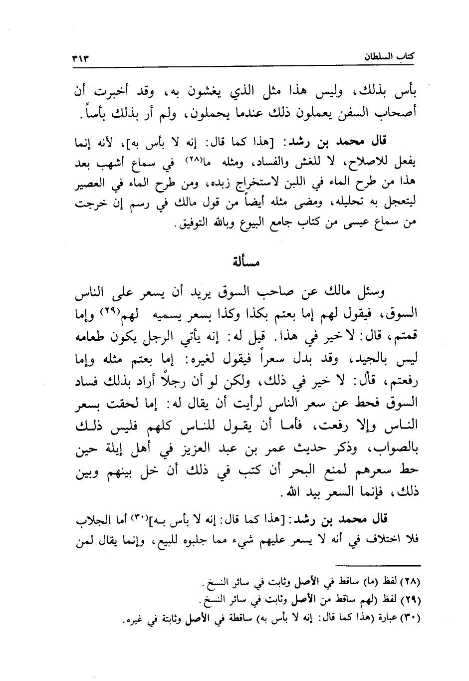 مسألة وسئل مالك عن صاحب السوق يريد أن يسعر على الناس السوق، فيقول لهم: إما بعتم بكذا وكذا، بسعر يسميه لهم، وإما قمتم، قال: لا خير في هذا. قيل له: إنه يأتي الرجل يكون طعامه ليس بالجيد، وقد بدل سعرا فيقول لغيره: إما بعتم مثله، وإما رفعتم، قال: لا خير في ذلك، ولكن لو أن رجلا أراد بذلك فساد السوق، فحط عن سعر الناس لرأيت أن يقال له: إما لحقت بسعر الناس وإلا رفعت، فأما أن يقول للناس كلهم، فليس ذلك بالصواب، وذكر حديث عمر بن عبد العزيز في أهل أيلة حين حط سعرهم لمنع البحر، أن كتب في ذلك أن خل بينهم وبين ذلك، فإنما السعر بيد الله.
