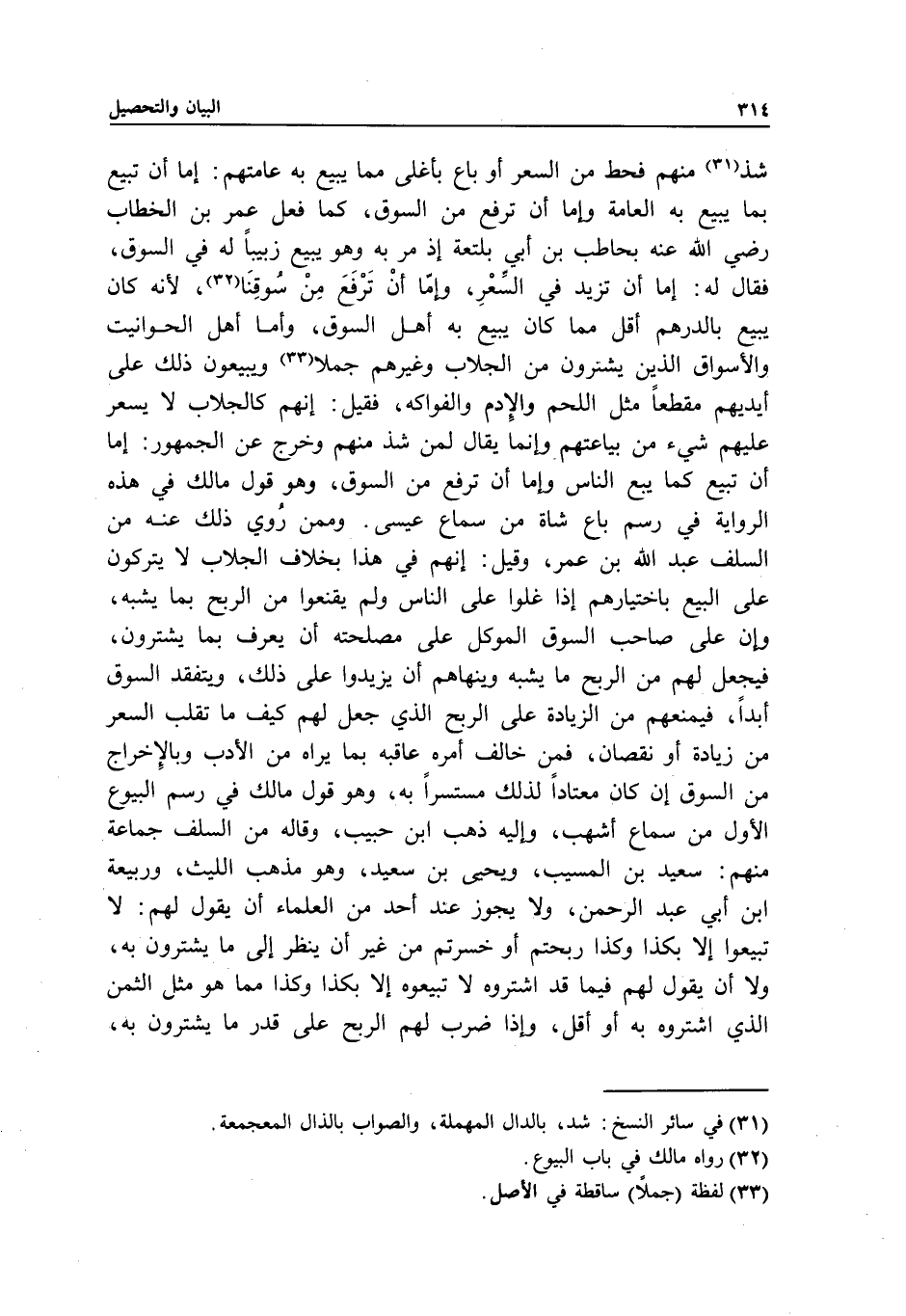 وممن روي ذلك عنه من السلف عبد الله بن عمر، وقيل: إنهم في هذا بخلاف الجلاب، لا يتركون على البيع باختيارهم إذا غلوا على الناس ولم يقنعوا من الربح بما يشبه، كان على صاحب السوق الموكل على مصلحته أن يعرف بما يشترون، فيجعل لهم من الربح ما يشبه، وينهاهم أن يزيدوا على ذلك، ويتفقد السوق أبدا، فيمنعهم من الزيادة على الربح الذي جعل لهم كيف ما تقلب السعر من زيادة أو نقصان، فمن خالف أمره عاقبه بما يراه من الأدب، وبالإخراج من السوق إن كان معتادا لذلك مستسرا به، وهو قول مالك في رسم البيوع الأول، من سماع أشهب، وإليه ذهب ابن حبيب، وقاله من السلف جماعة منهم: سعيد بن المسيب، ويحيى بن سعيد، وهو مذهب الليث، وربيعة بن أبي عبد الرحمن، ولا يجوز عند أحد من العلماء أن يقول لهم: لا تبيعوا إلا بكذا وكذا، ربحتم أو خسرتم من غير أن ينظر إلى ما يشترون به، ولا أن يقول لهم فيما قد اشتروه لا تبيعوه إلا بكذا وكذا مما هو مثل الثمن الذي اشتروه به أو أقل، وإذا ضرب لهم الربح على قدر ما يشترون به،