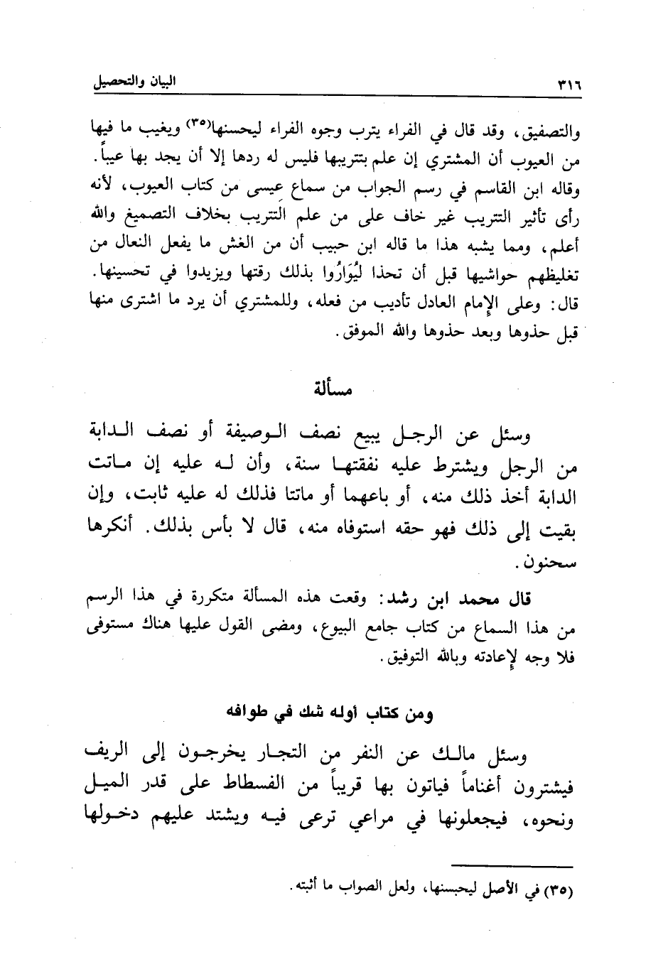 قال محمد بن رشد: وقعت هذه المسألة متكررة في هذا الرسم من هذا السماع، من كتاب جامع البيوع، ومضى القول عليها هناك مستوفى، فلا وجه لإعادته، وبالله التوفيق.