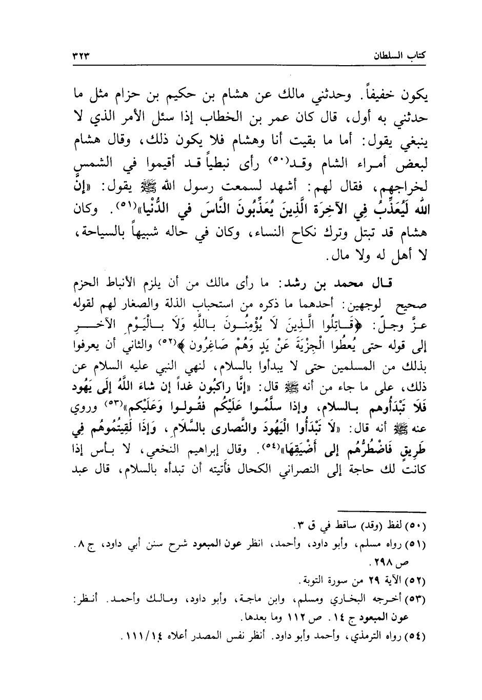 قال محمد بن رشد: ما رأى مالك من أن يلزم الأنباط الحزم صحيح لوجهين؛ أحدهما: ما ذكره من استحباب الذلة والصغار لهم؛ لقوله عز وجل: {قَاتِلُوا الَّذِينَ لا يُؤْمِنُونَ بِاللَّهِ وَلا بِالْيَوْمِ الآخِرِ} [التوبة: 29] إلى قوله: {حَتَّى يُعْطُوا الْجِزْيَةَ عَنْ يَدٍ وَهُمْ صَاغِرُونَ} [التوبة: 29] . والثاني: أن يعرفوا بذلك من المسلمين حتى لا يبدءوا بالسلام؛ لنهي النبي - عَلَيْهِ السَّلَامُ - عن ذلك، على ما جاء من أنه - صَلَّى اللَّهُ عَلَيْهِ وَسَلَّمَ - قال: «إنا راكبون غدا إن شاء الله إلى يهود، فلا تبدءوهم بالسلام، وإذا سلموا عليكم فقولوا: وعليكم» ، وروي عنه - صَلَّى اللَّهُ عَلَيْهِ وَسَلَّمَ - أنه قال: «لا تبدءوا اليهود والنصارى بالسلام، وإذا لقيتموهم في طريق فاضطروهم إلى أضيقها» ، وقال إبراهيم النخعي: لا بأس إذا كانت لك حاجة إلى النصراني الكحال، فأتيته أن تبدأه بالسلام، قال عبد