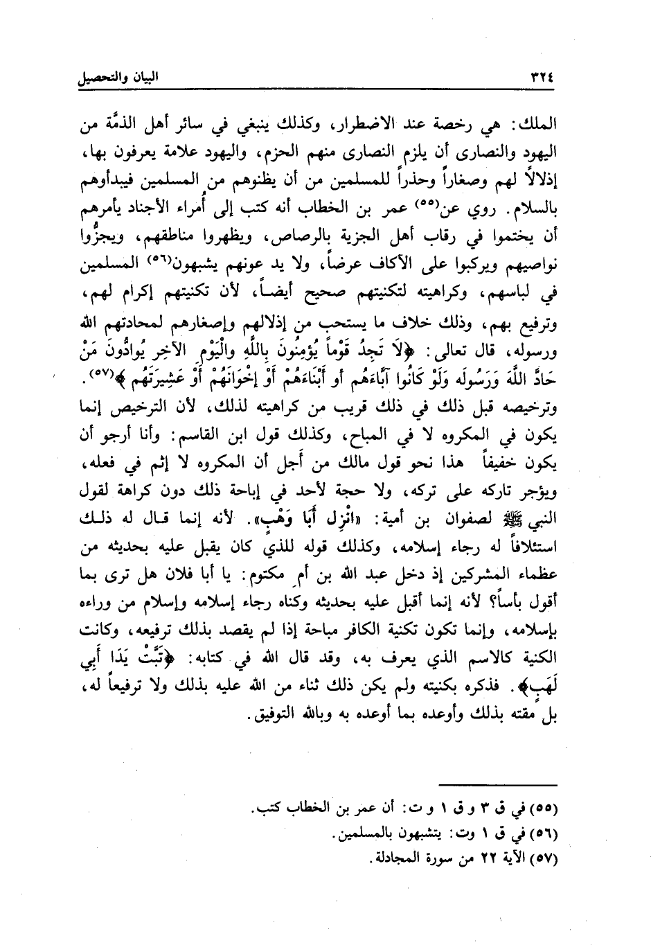 وترخيصه قبل ذلك في ذلك قريب من كراهيته لذلك؛ لأن الترخيص إنما يكون في المكروه لا في المباح، وكذلك قول ابن القاسم: وأنا أرجو أن يكون خفيفا هذا نحو قول مالك من أجل أن المكروه لا إثم في فعله، ويؤجر تاركه على تركه، ولا حجة لأحد في إباحة ذلك دون كراهة؛ لقول النبي - صَلَّى اللَّهُ عَلَيْهِ وَسَلَّمَ - لصفوان بن أمية: «انزل أبا وهب» ؛ لأنه إنما قال له ذلك استئلافا له رجاء إسلامه، وكذلك قوله للذي كان يقبل عليه بحديثه من عظماء المشركين؛ إذ دخل عبد الله بن أم مكتوم: «يا أبا فلان، هل ترى بما أقول بأسا؟» لأنه إنما أقبل عليه بحديثه وكناه رجاء إسلامه وإسلام من وراءه بإسلامه، وإنما تكون تكنية الكافر مباحة إذا لم يقصد بذلك ترفيعه، وكانت الكنية كالاسم الذي يعرف به، وقد قال الله في كتابه: {تَبَّتْ يَدَا أَبِي لَهَبٍ} [المسد: 1] ، فذكره بكنيته، ولم يكن ذلك ثناء من الله عليه بذلك، ولا ترفيعا له، بل مقته بذلك، وأوعده بما أوعده به، وبالله التوفيق.