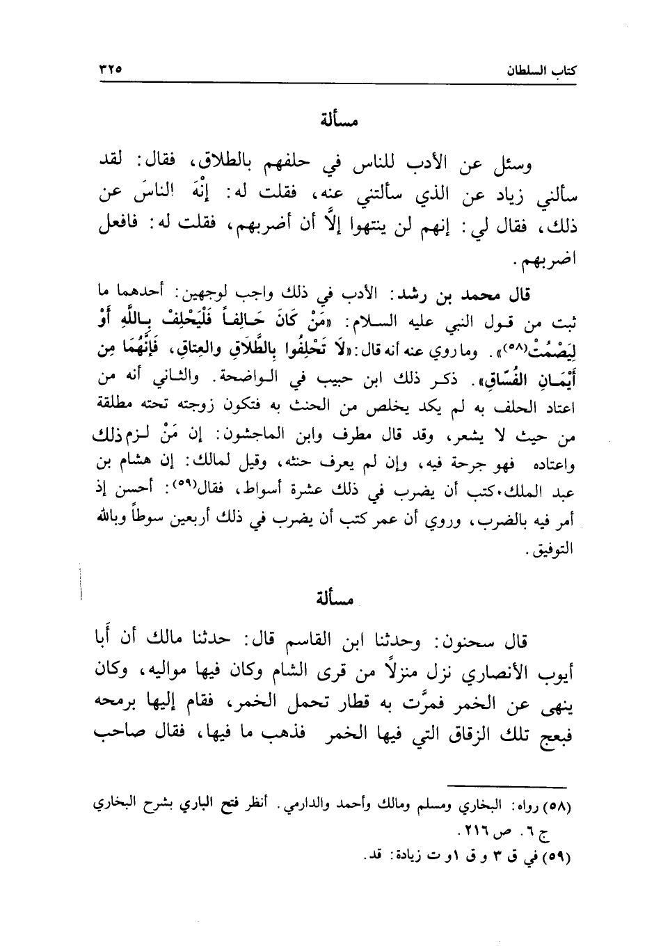 مسألة وسئل عن الأدب للناس في حلفهم بالطلاق، فقال: لقد سألني زياد عن الذي سألتني عنه، فقلت له: إنه الناس عن ذلك، فقال لي: إنهم لن ينتهوا إلا أن أضربهم، فقلت له: فافعل، اضربهم.