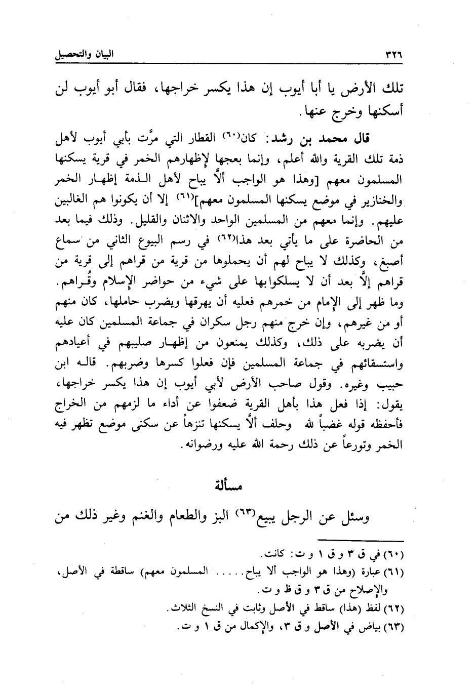 قال محمد بن رشد: كان القطار التي مرت بأبي أيوب لأهل ذمة تلك القرية، والله أعلم، وإنما بعجها لإظهارهم الخمر في قرية يسكنها المسلمون معهم، وهذا هو الواجب ألا يباح لأهل الذمة إظهار الخمر والخنازير في موضع يسكنها المسلمون معهم، إلا أن يكونوا هم الغالبين عليهم، وإنما معهم من المسلمين الواحد والاثنان والقليل. وذلك فيما بعد من الحاضرة على ما يأتي بعد هذا، في رسم البيوع الثاني، من سماع أصبغ، وكذلك لا يباح لهم أن يحملوها من قرية من قراهم إلى قرية من قراهم، إلا بعد أن لا يسلكوا بها على شيء من حواضر الإسلام وقراهم.