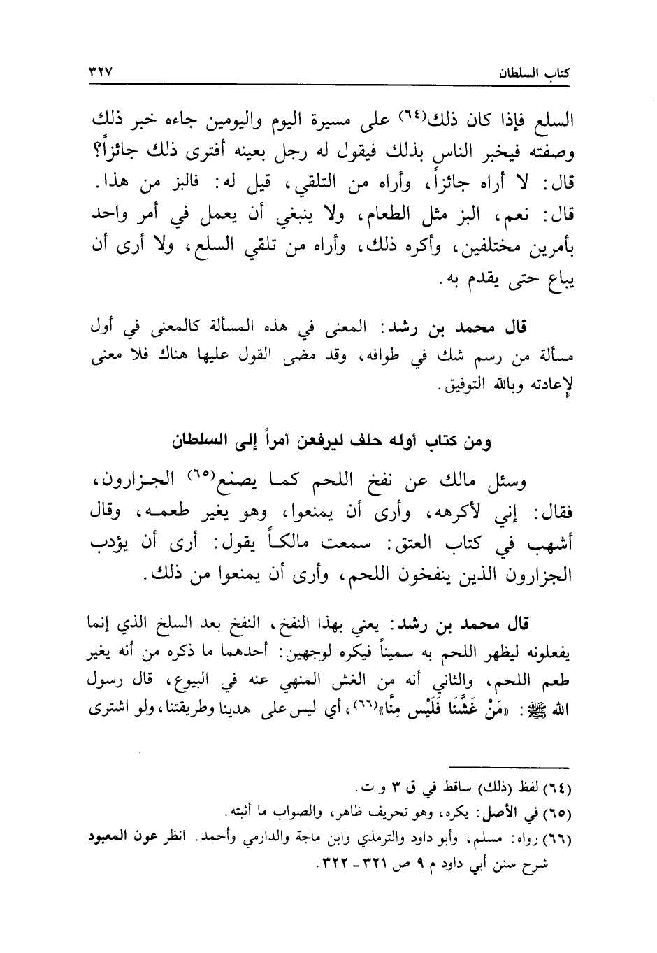قال محمد بن رشد: يعني بهذا النفخ، النفخ بعد السلخ الذي إنما يفعلونه ليظهر اللحم به سمينا، فيكره لوجهين؛ أحدهما: ما ذكره من أنه يغير طعم اللحم. والثاني: أنه من الغش المنهي عنه في البيوع؛ قال رسول الله - صَلَّى اللَّهُ عَلَيْهِ وَسَلَّمَ -: «من غشنا فليس منا» ، أي ليس على هدينا وطريقتنا، ولو اشترى