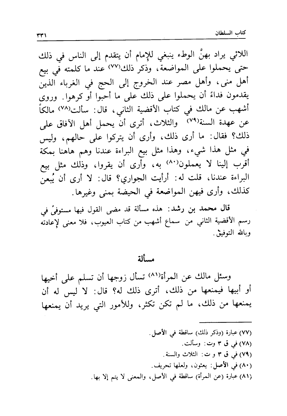 وروى أشهب عن مالك في كتاب الأقضية الثاني، قال: سألت مالكا عن عهدة السنة والثلاث، أترى أن يحمل أهل الآفاق على ذلك؟ فقال: ما أرى ذلك، وأرى أن يتركوا على حالهم، وليس في مثل هذا شيء، وهذا مثل بيع البراءة عندنا، وهم هاهنا بمكة أقرب إلينا لا يعملون به، وأرى أن يقروا، وذلك مثل بيع البراءة عندنا، قلت له: أرأيت الجواري؟ قال: لا أرى أن يبعن كذلك، وأرى فيهن المواضعة في الحيضة بمنى وغيرها.