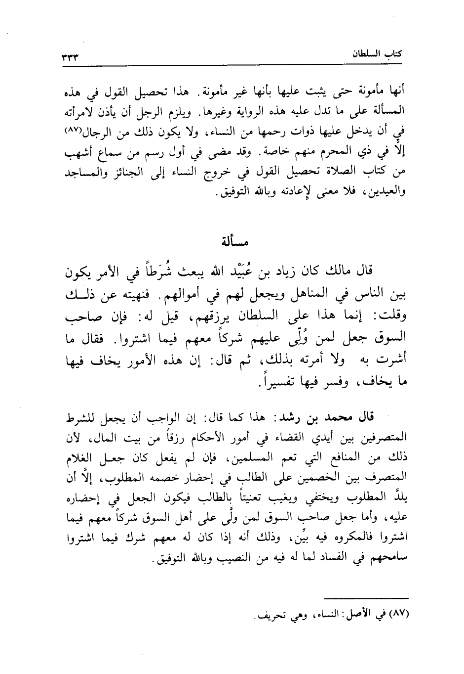 مسألة قال مالك: كان زياد بن عبيد الله يبعث شرطا في الأمر يكون بين الناس في المناهل، ويجعل لهم في أموالهم؛ فنهيته عن ذلك، وقلت: إنما هذا على السلطان يرزقهم، قيل له: فإن صاحب السوق جعل لمن ولي عليهم شركا معهم فيما اشتروا، فقال: ما أشرت به ولا أمرته بذلك، ثم قال: إن هذه الأمور يخاف فيها ما يخاف، وفسر فيها تفسيرا.