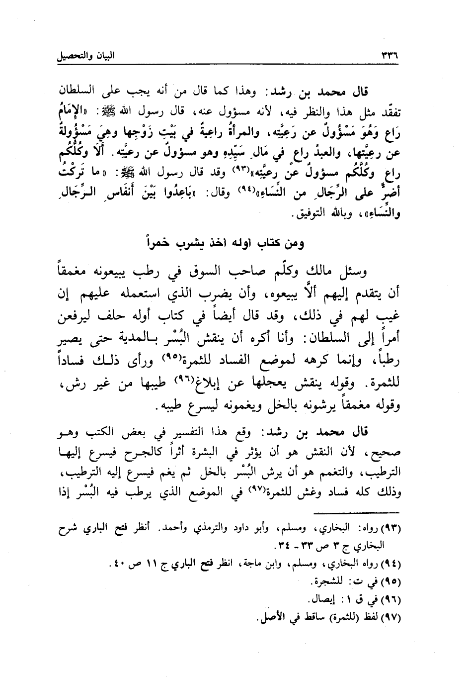 قال محمد بن رشد: وهذا كما قال من أنه يجب على السلطان تفقد مثل هذا والنظر فيه؛ لأنه مسئول عنه، قال رسول الله - صَلَّى اللَّهُ عَلَيْهِ وَسَلَّمَ -: «الإمام راع وهو مسئول عن رعيته، والمرأة راعية في بيت زوجها وهي مسئولة عن رعيتها، والعبد راع في مال سيده وهو مسئول عن رعيته؛ ألا وكلكم راع وكلكم مسئول عن رعيته» ، وقد قال رسول الله - صَلَّى اللَّهُ عَلَيْهِ وَسَلَّمَ -: «ما تركت أضر على الرجال من النساء» ، وقال: «باعدوا بين أنفاس الرجال والنساء» ، وبالله التوفيق.