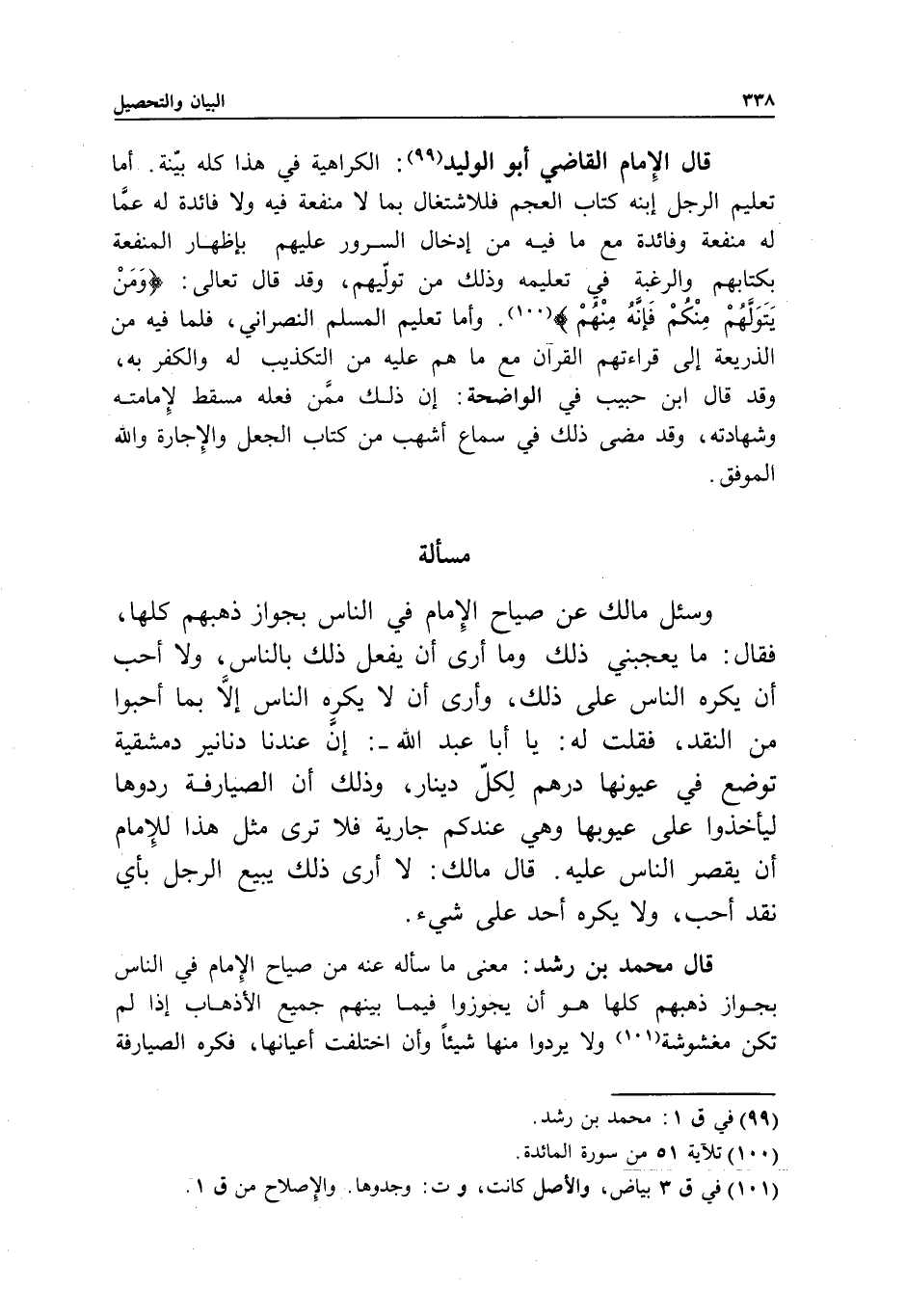 قال الإمام القاضي أبو الوليد: الكراهية في هذا كله بينة، أما تعليم الرجل ابنه كتاب العجم، فللاشتغال بما لا منفعة فيه، ولا فائدة له، عما له منفعة وفائدة مع ما فيه من إدخال السرور عليهم بإظهار المنفعة بكتابهم والرغبة في تعليمه، وذلك من توليهم، وقد قال تعالى: {وَمَنْ يَتَوَلَّهُمْ مِنْكُمْ فَإِنَّهُ مِنْهُمْ} [المائدة: 51] ، وأما تعليم المسلم النصراني، فلما فيه من الذريعة إلى قراءتهم القرآن مع ما هم عليه من التكذيب له والكفر به، وقد قال ابن حبيب في الواضحة: إن ذلك ممن فعله مسقط لإمامته وشهادته، وقد مضى ذلك في سماع أشهب، من كتاب الجعل والإجارة، والله الموفق.