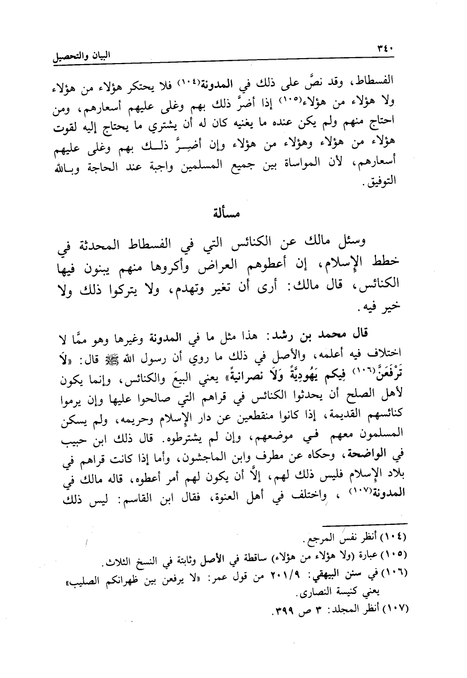 مسألة وسئل مالك عن الكنائس التي في الفسطاط المحدثة في خطط الإسلام، إن أعطوهم العراض، وأكروها منهم يبنون فيها الكنائس، قال مالك: أرى أن تغير وتهدم، ولا يتركوا ذلك، ولا خير فيه.