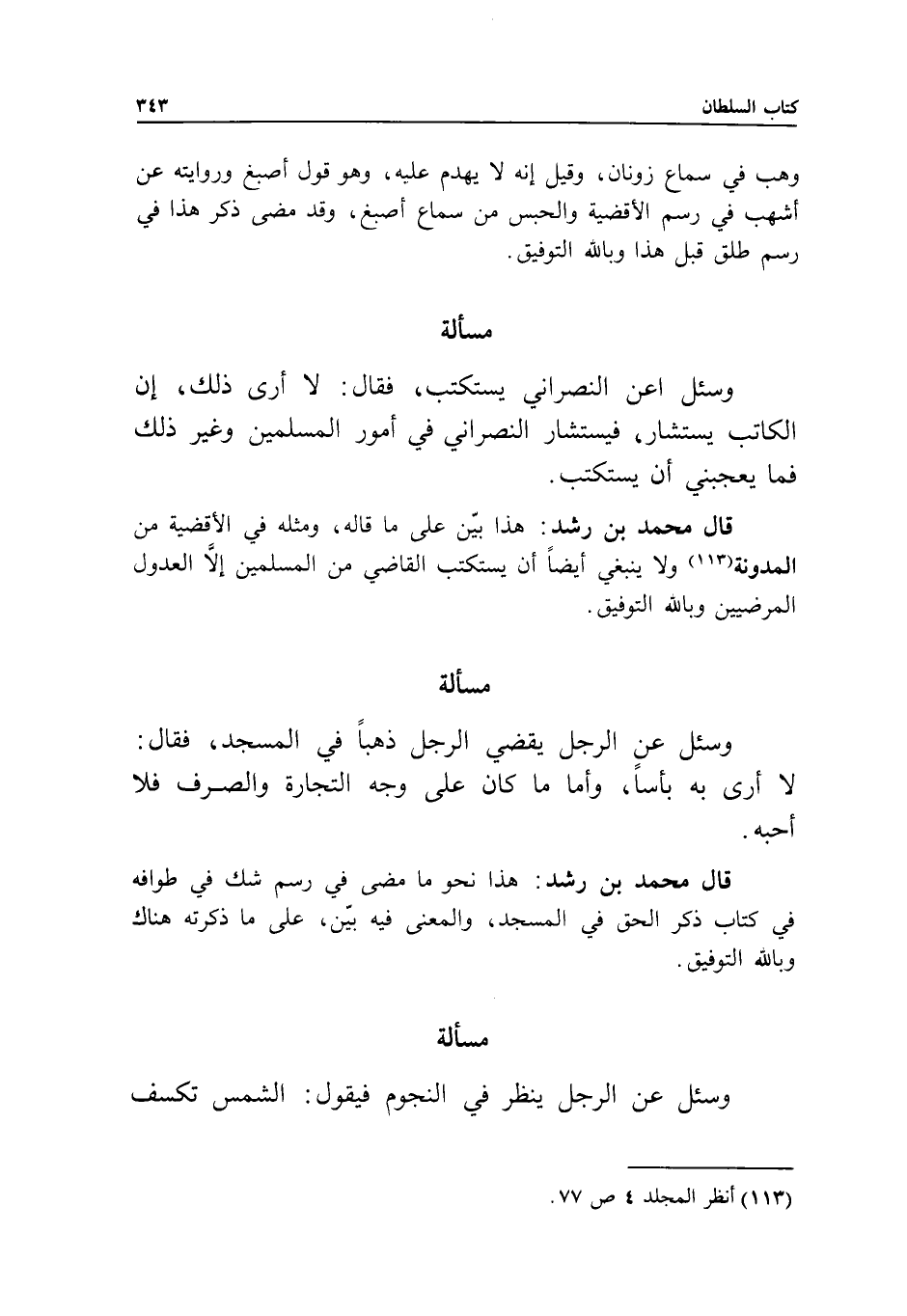 مسألة وسئل عن النصراني يستكتب، فقال: لا أرى ذلك، إن الكاتب يستشار، فيستشار النصراني في أمور المسلمين وغير ذلك، فما يعجبني أن يستكتب.