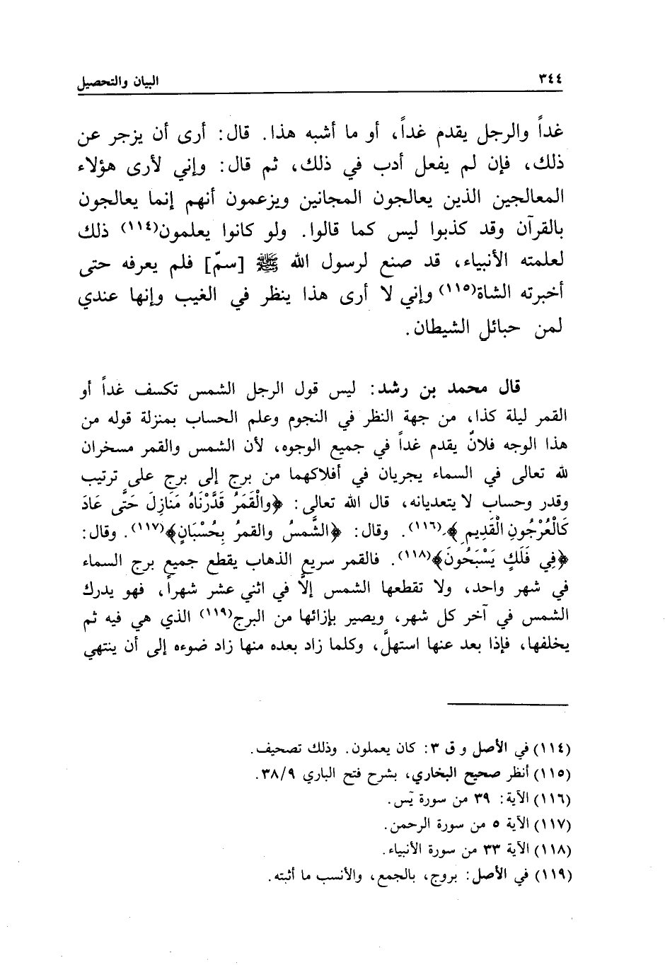 قال محمد بن رشد: ليس قول الرجل الشمس تكسف غدا، أو القمر ليلة كذا، من جهة النظر في النجوم وعلم الحساب بمنزلة قوله من هذا الوجه فلان يقدم غدا في جميع الوجوه؛ لأن الشمس والقمر مسخران لله تعالى في السماء، يجريان في أفلاكهما من برج إلى برج على ترتيب وقدر وحساب لا يتعديانه، قال الله تعالى: {وَالْقَمَرَ قَدَّرْنَاهُ مَنَازِلَ حَتَّى عَادَ كَالْعُرْجُونِ الْقَدِيمِ} [يس: 39] ، وقال: {الشَّمْسُ وَالْقَمَرُ بِحُسْبَانٍ} [الرحمن: 5] ، وقال: {فِي فَلَكٍ يَسْبَحُونَ} [يس: 40] ؛ فالقمر سريع الذهاب يقطع جميع برج السماء في شهر واحد، ولا تقطعها الشمس إلا في اثني عشر شهرا، فهو يدرك الشمس في آخر كل شهر، ويصير بإزائها من البرج الذي هي فيه، ثم يخلفها، فإذا بعد عنها استهل، وكلما زاد بعده منها زاد ضوؤه، إلى أن ينتهي