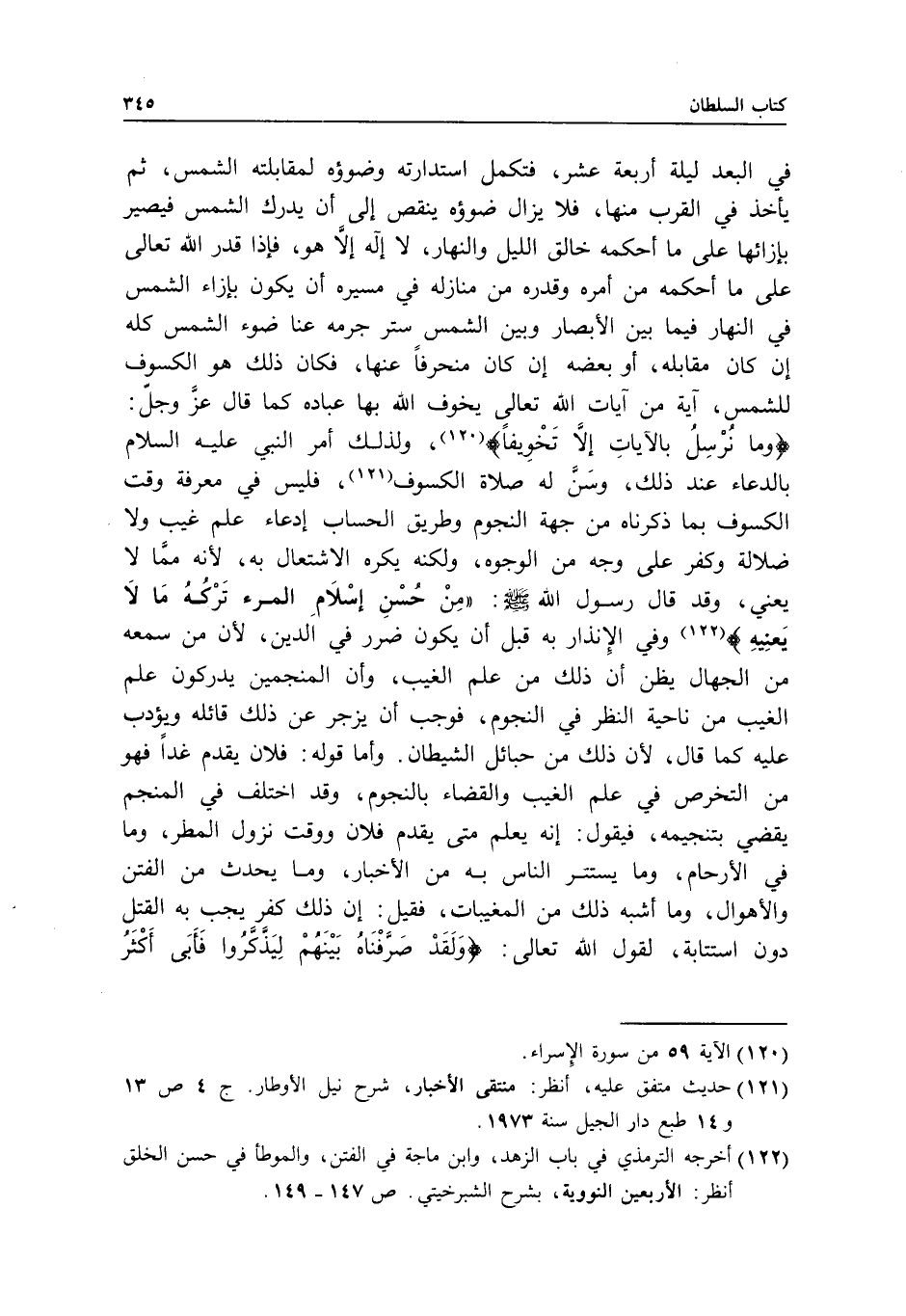 فإذا قدر الله تعالى على ما أحكمه من أمره وقدره من منازله في مسيره أن يكون بإزاء الشمس في النهار فيما بين الأبصار وبين الشمس ستر جرمه عنا ضوء الشمس كله إن كان مقابله، أو بعضه إن كان منحرفا عنها، فكان ذلك هو الكسوف للشمس، آية من آيات الله تعالى، يخوف الله بها عباده، كما قال عز وجل: {وَمَا نُرْسِلُ بِالآيَاتِ إِلا تَخْوِيفًا} [الإسراء: 59] ، ولذلك أمر النبي - عَلَيْهِ السَّلَامُ - بالدعاء عند ذلك، وسن له صلاة الكسوف، فليس في معرفة وقت الكسوف بما ذكرناه من جهة النجوم وطريق الحساب ادعاء علم غيب، ولا ضلالة وكفر على وجه من الوجوه، ولكنه يكره الاشتغال به؛ لأنه مما لا يعني، وقد قال رسول الله - صَلَّى اللَّهُ عَلَيْهِ وَسَلَّمَ -: «من حسن إسلام المرء تركه ما لا يعنيه» وفي الإنذار به قبل أن يكون ضرر في الدين؛ لأن من سمعه من الجهال يظن أن ذلك من علم الغيب، وأن المنجمين يدركون علم الغيب من ناحية النظر في النجوم، فوجب أن يزجر عن ذلك قائله، ويؤدب عليه كما قال؛ لأن ذلك من حبائل الشيطان.