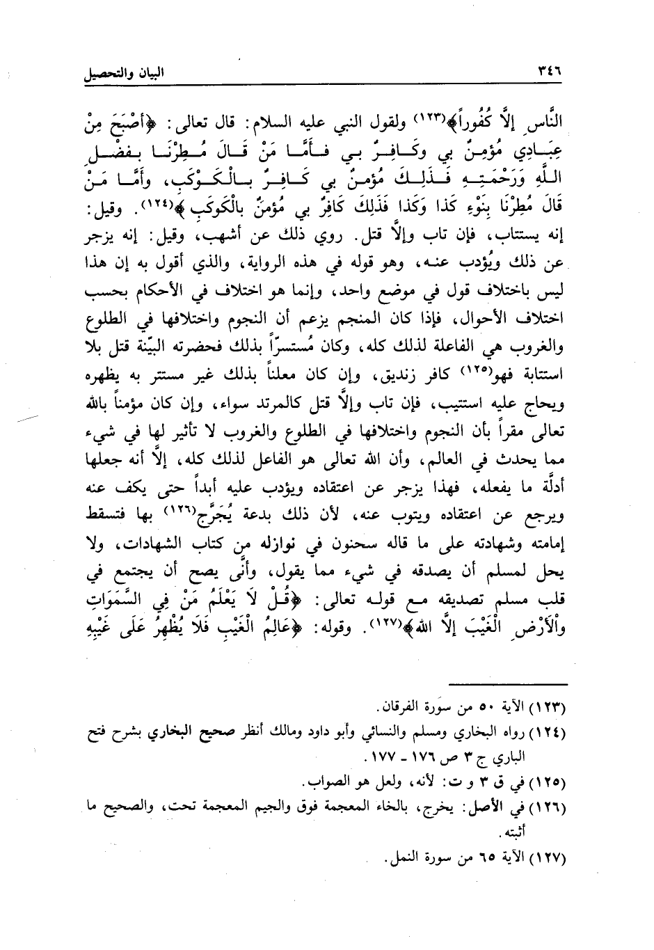 ولقول النبي - عَلَيْهِ السَّلَامُ -: قال تعالى: «أصبح من عبادي مؤمن بي وكافر بي، فأما من قال: مطرنا بفضل الله ورحمته، فذلك مؤمن بي كافر بالكوكب، وأما من قال: مطرنا بنوء كذا وكذا، فذلك كافر بي مؤمن بالكوكب» . وقيل: إنه يستتاب، فإن تاب وإلا قتل.